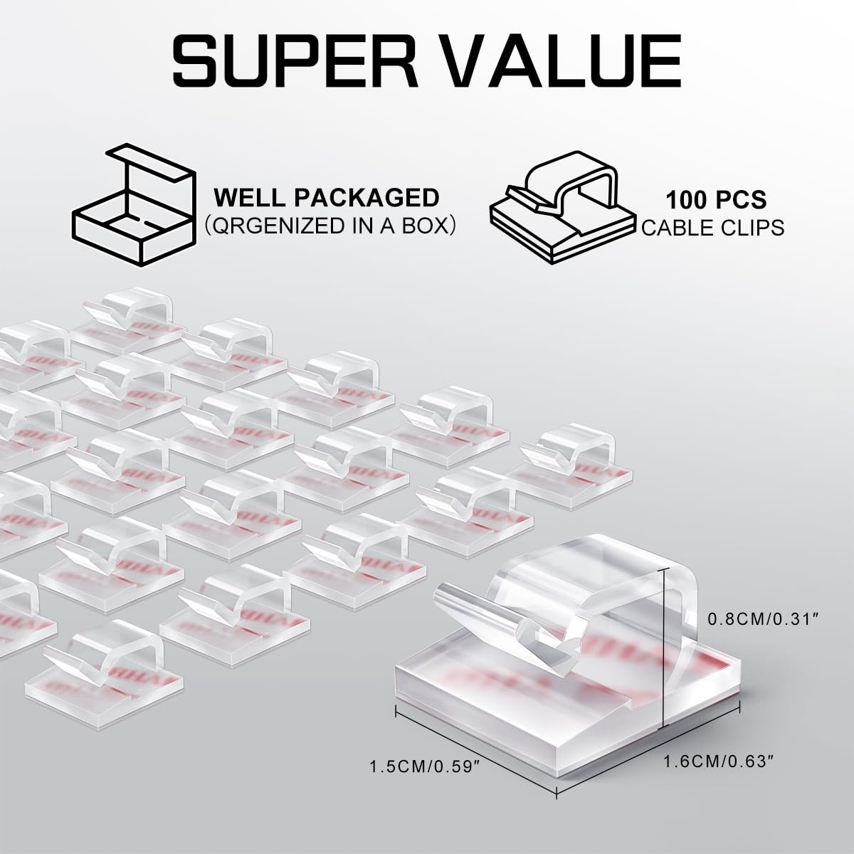 Adhesive Cable Clips: Made of high-quality PC plastic and strong adhesive, strong and durable. No drilling is required for use, no residue is left behind, and the surface will not be damaged. Set contains 100 cable clips, cable clips size: 16x15x8mm.