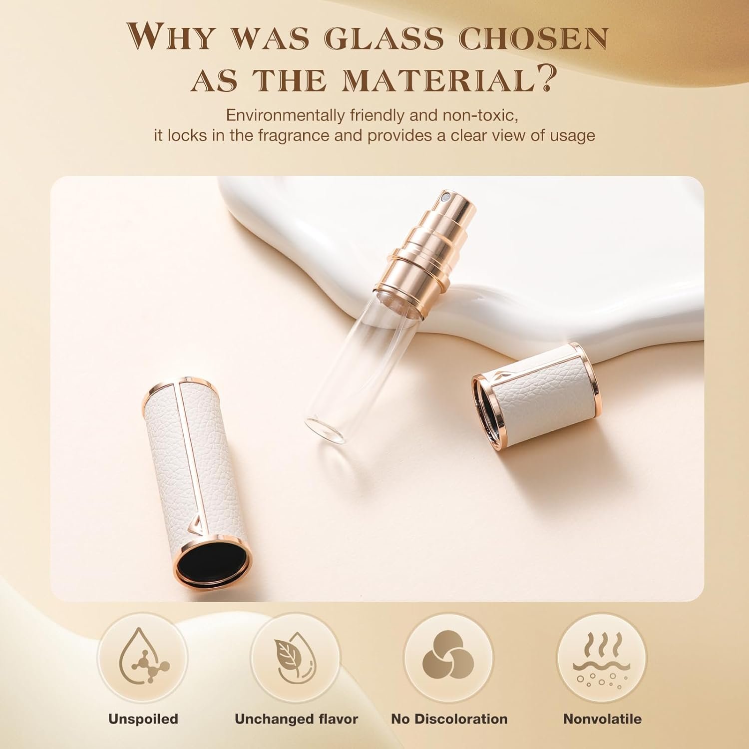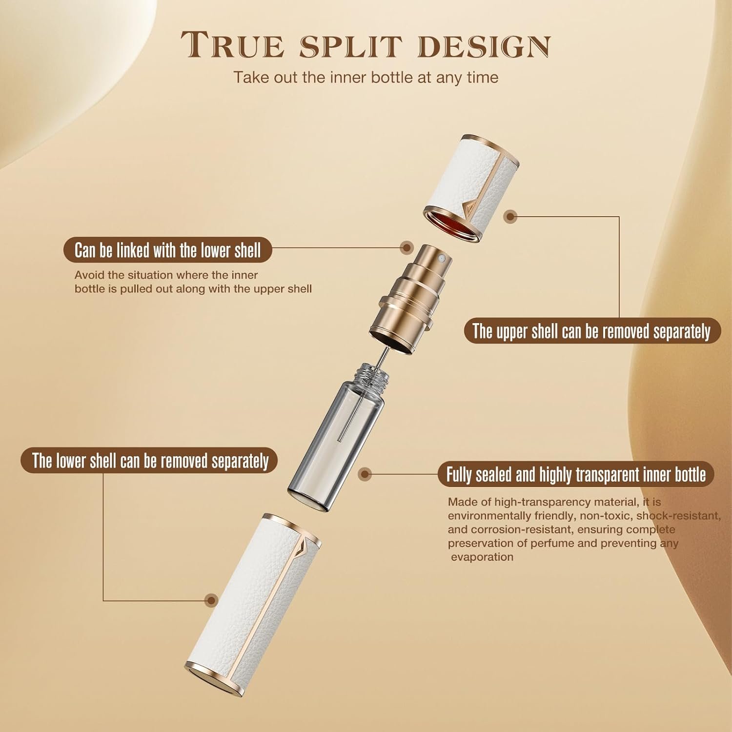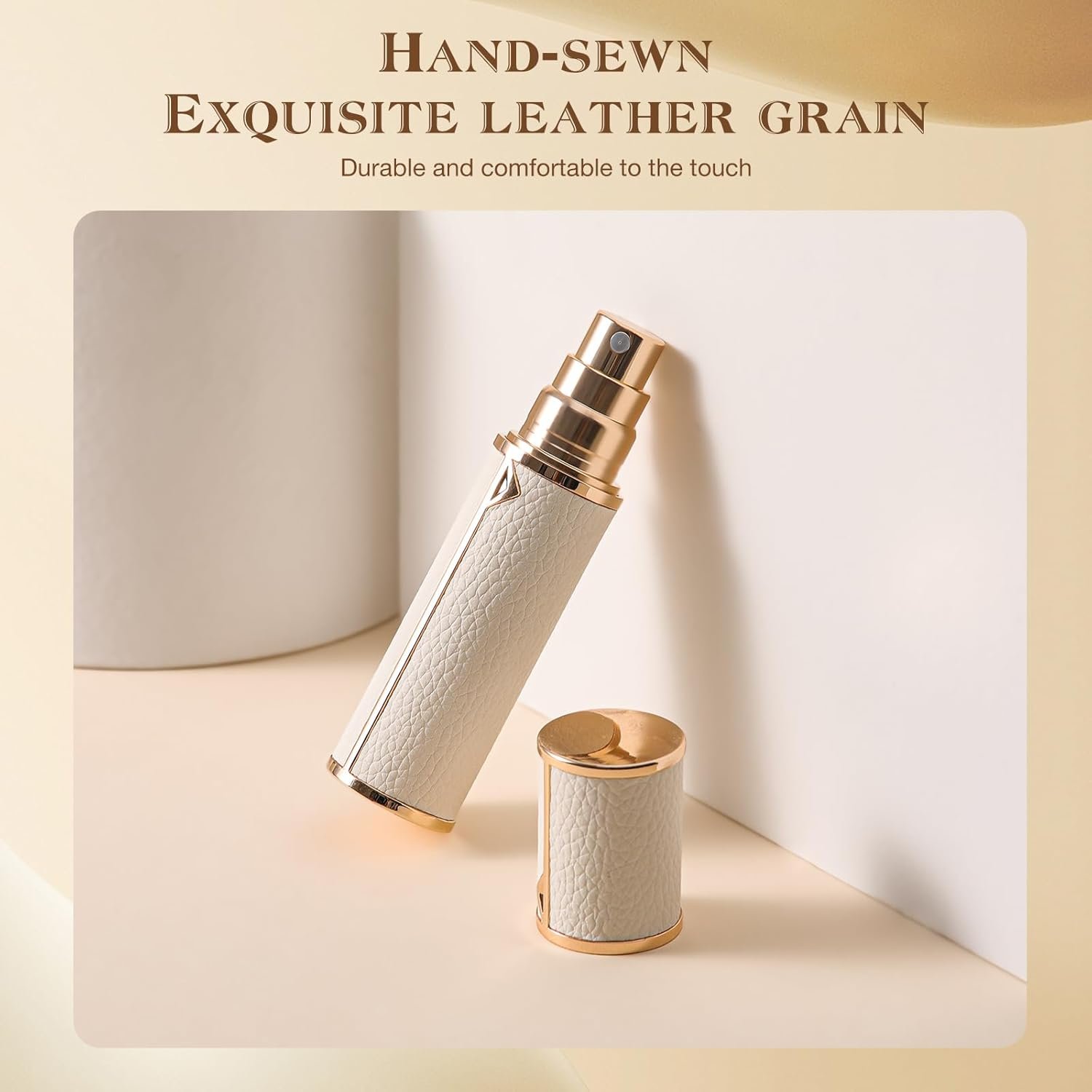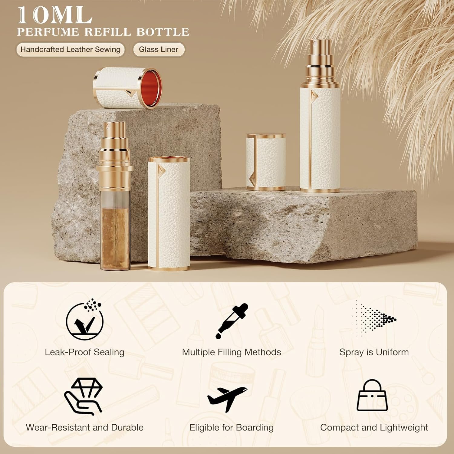 Leather Shell and Elegant Design: The dispenser is made of lightweight leather for a comfortable and attractive appearance. Open the lid, pull out the small glass bottle, and fill the cosmetics into the bottle using a funnel or dispenser tool.