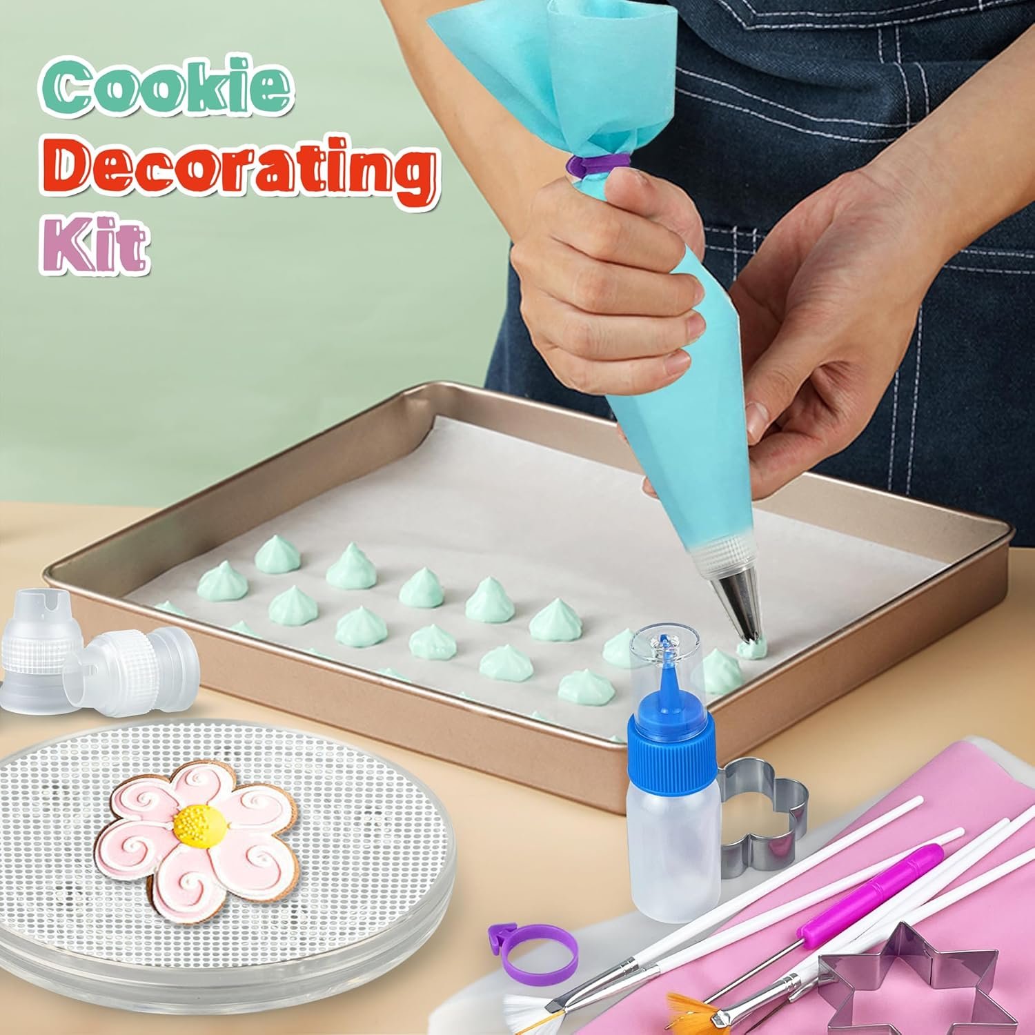 Package includes: You will get 2 acrylic cookie turntables 2 cookie scribe needles 15 cookie decorating brushes 2 non-slip silicone pads 20 disposable pipe bags 6 cake decorating nozzles 2 connectors 3 silicone pastry bags ties 2 silicone piping bags 2 icing bottles 50 cookie bags. Different kinds of tools to better complete your cookie decorating needs