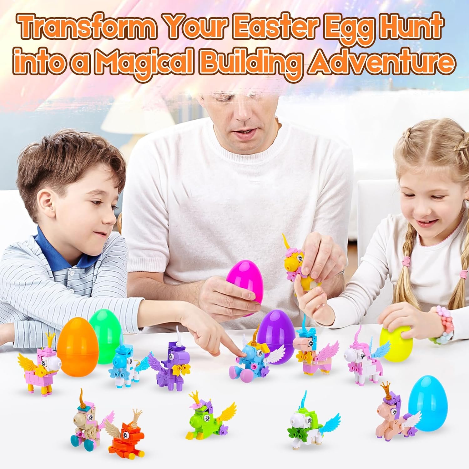 Children can enjoy searching for eggs outdoors and then assembling their unicorn toys with friends or family.