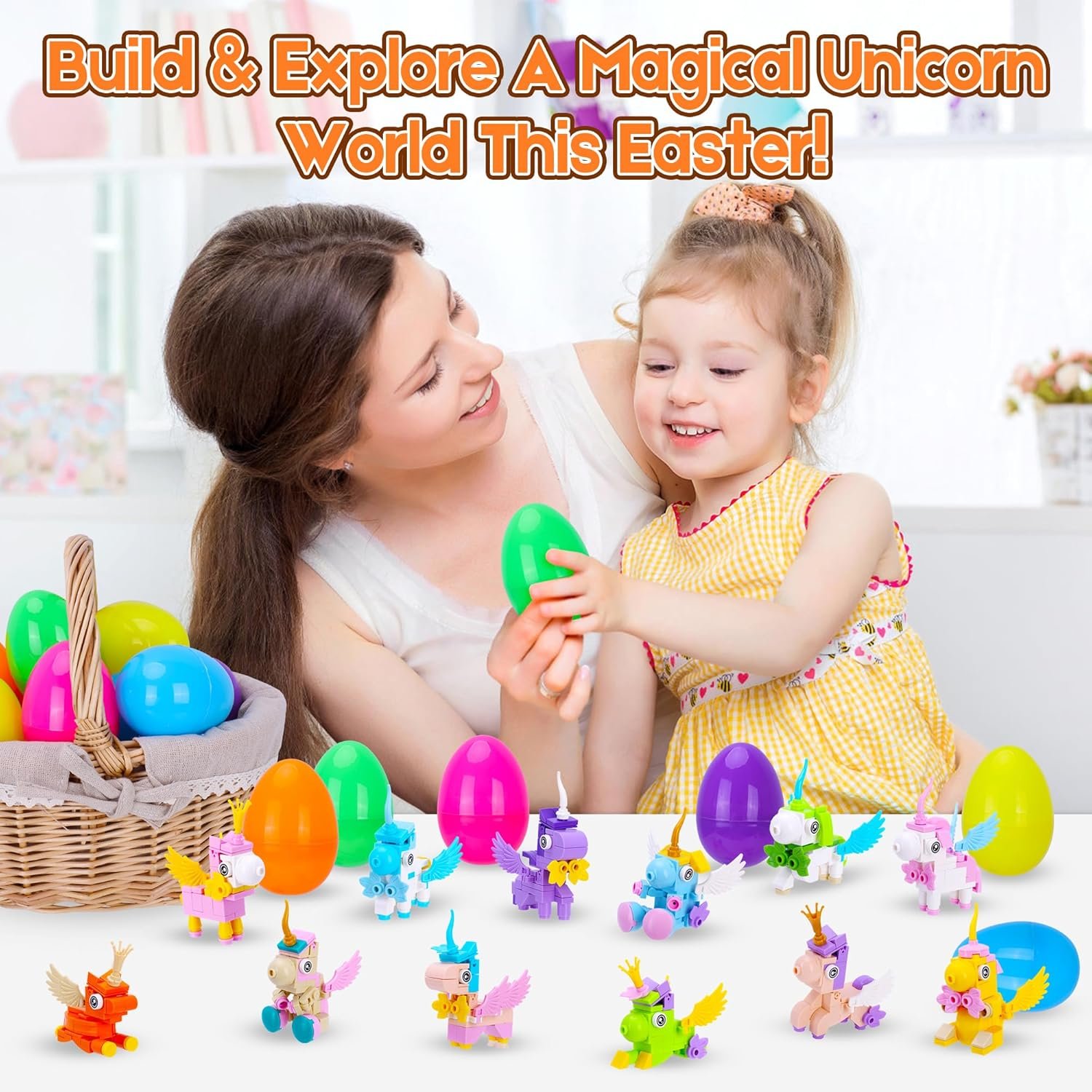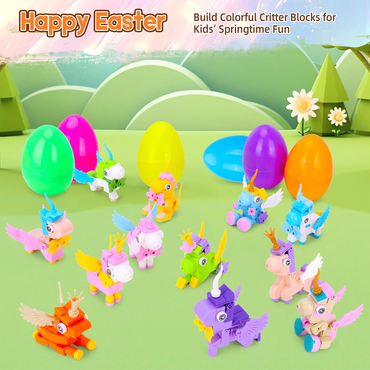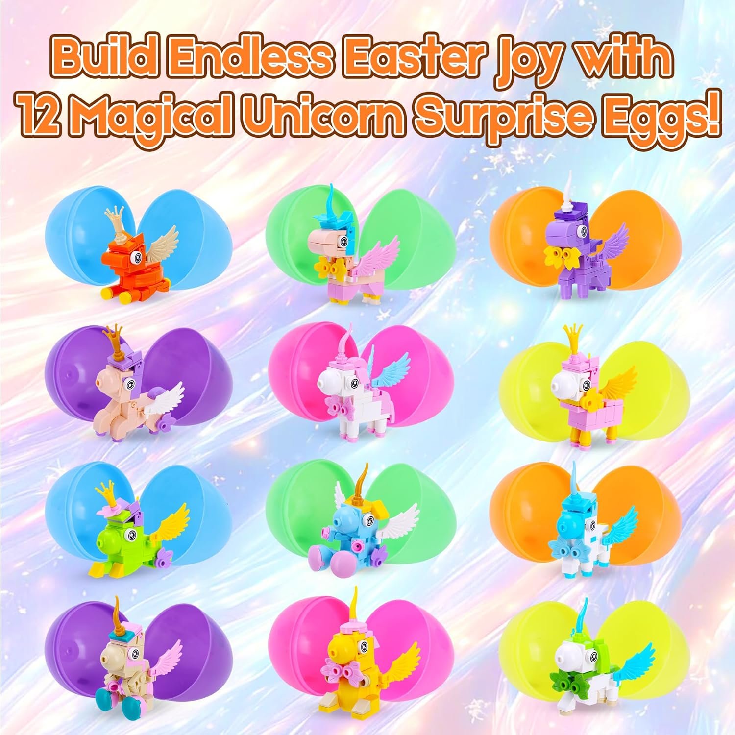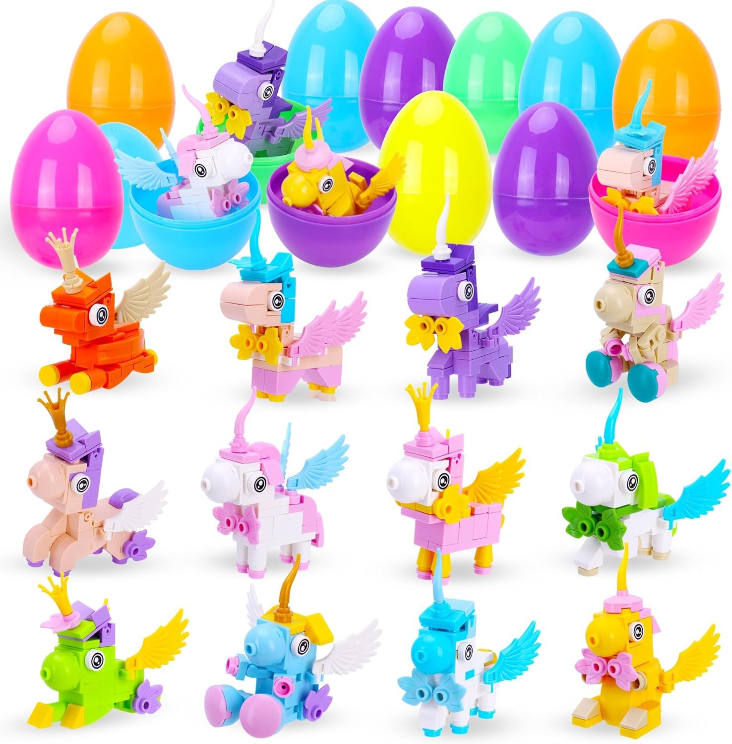 EASTER EGG SURPRISES – Includes 12 different mini unicorn building block and reusable plastic egg shells for easy hiding, gifting, and collecting during Easter season.