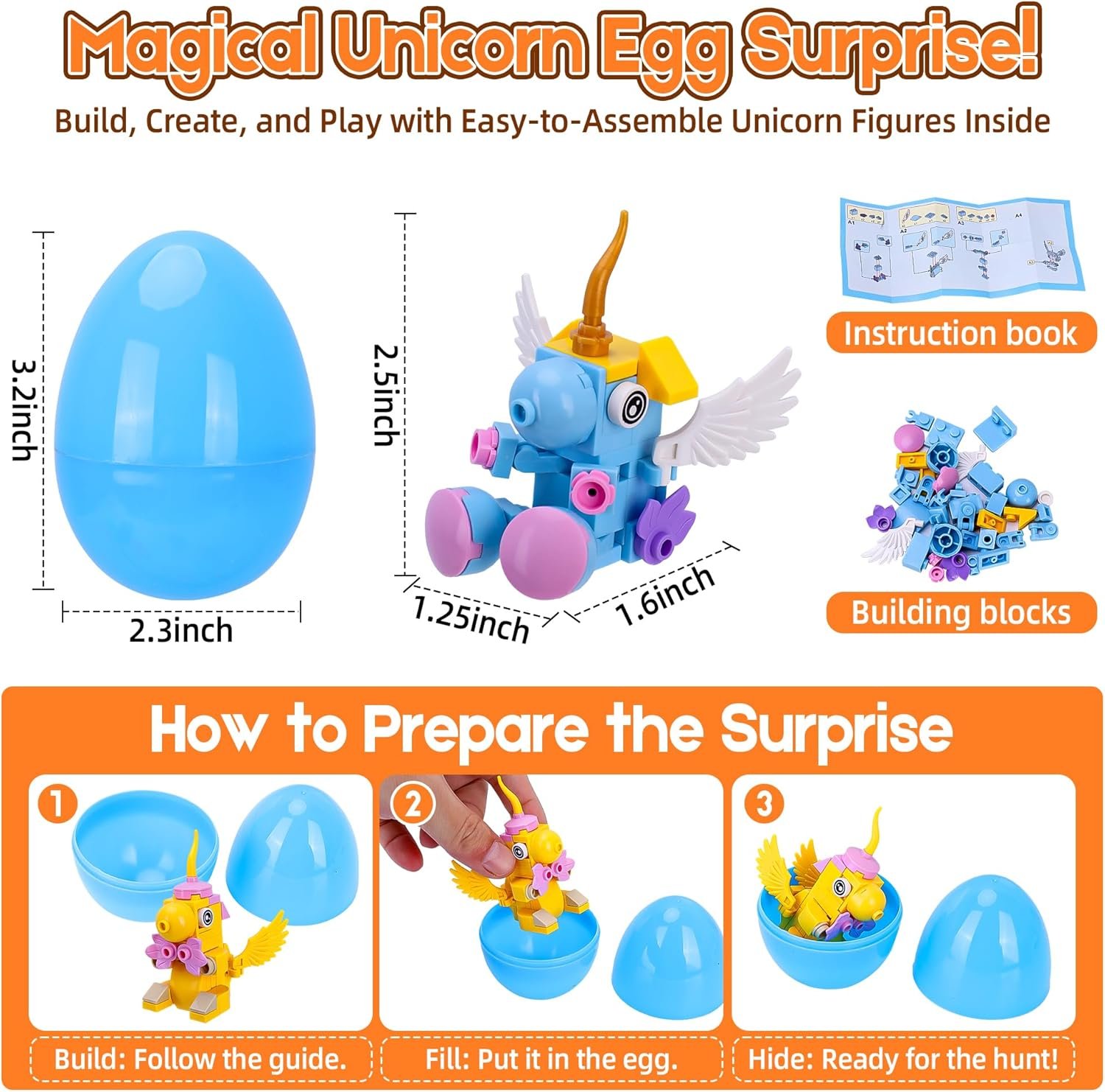 Each egg contains a mini unicorn building block set ready to assemble.