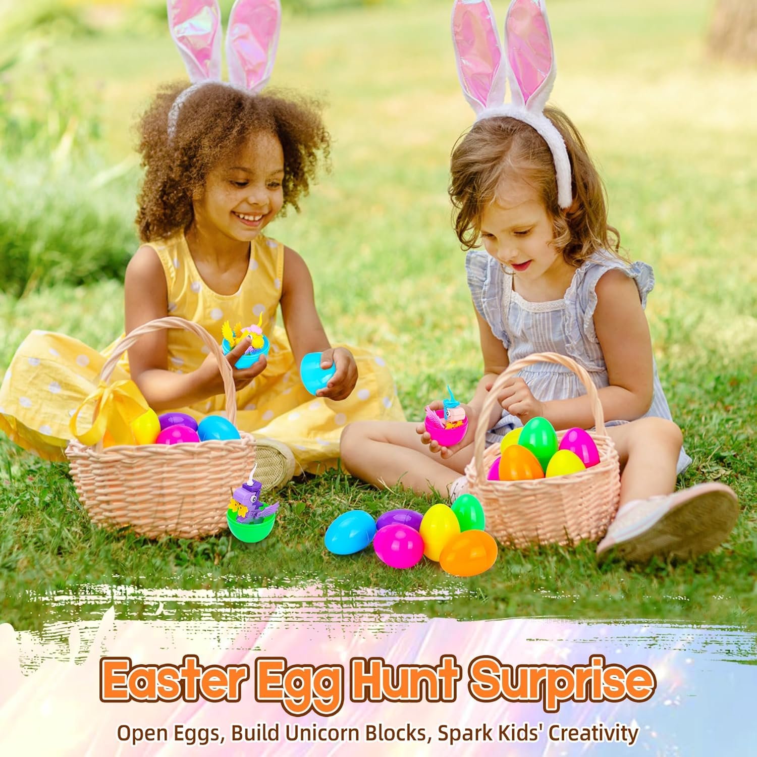 Kids can search for colorful eggs, open them, and discover a fun unicorn building surprise inside. The playful activity combines the excitement of an Easter egg hunt with the creativity of building toys, bringing laughter and excitement to spring celebrations.