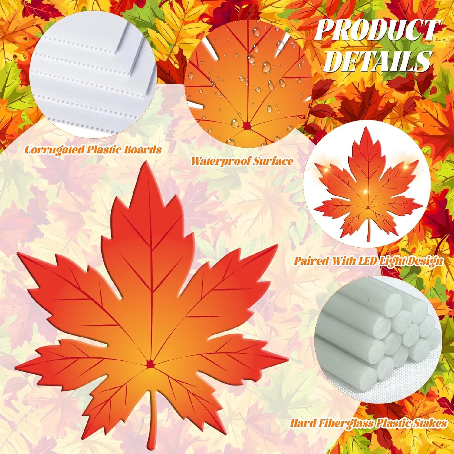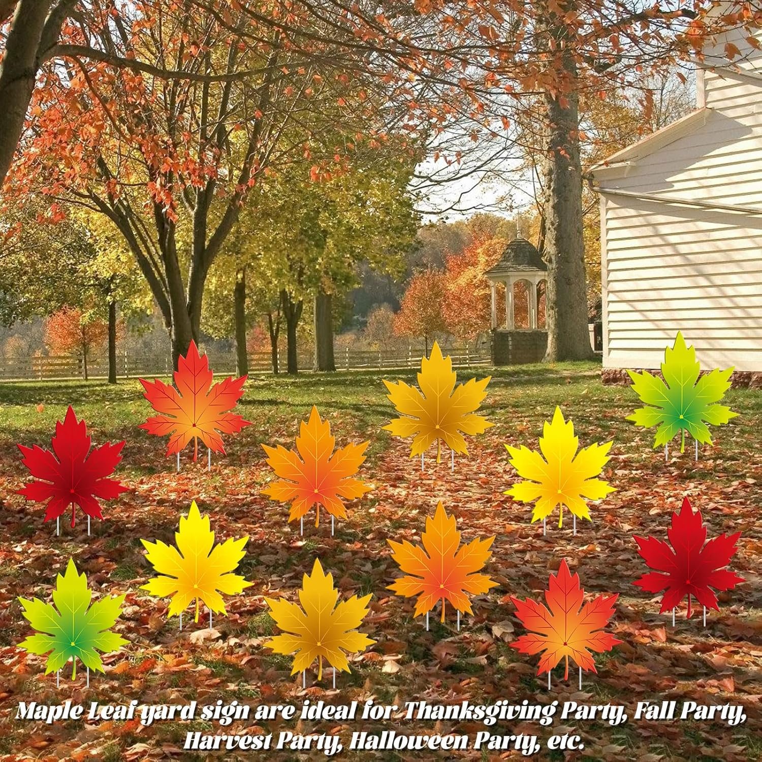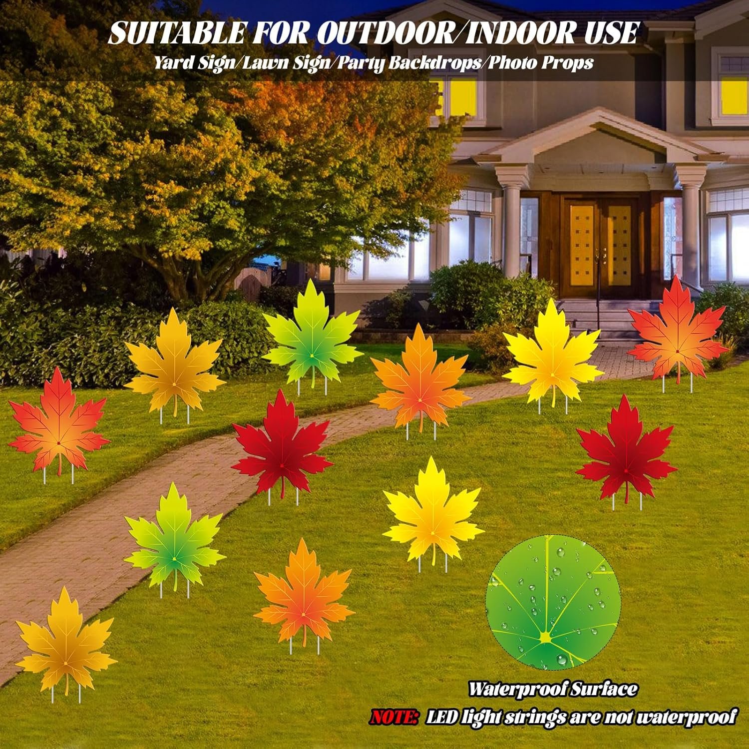 WIDE APPLICATIONS: Maple leaf outdoor decorations are ideal for Thanksgiving party, fall party, harvest party, Halloween party, etc. Can decorate your front yard, lawn, outdoor garden, front porch, pathway, patios entryways… Or use them as welcome signs, party backdrops, and even as photo props, etc.