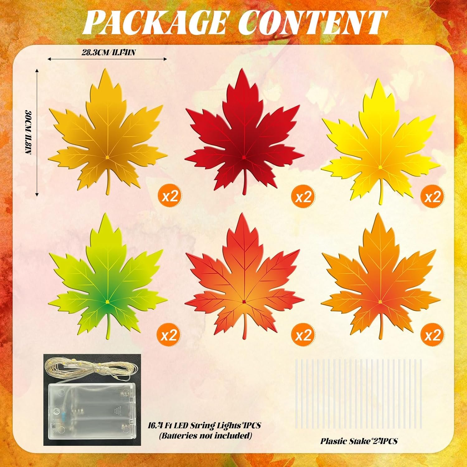 PACKAGE CONTENT: 12 PCS fall Maple Leaf Yard Signs with 24 pcs yard stakes, and 2 pcs 16.4 ft LED string lights (NOTE: 6atteries not included).