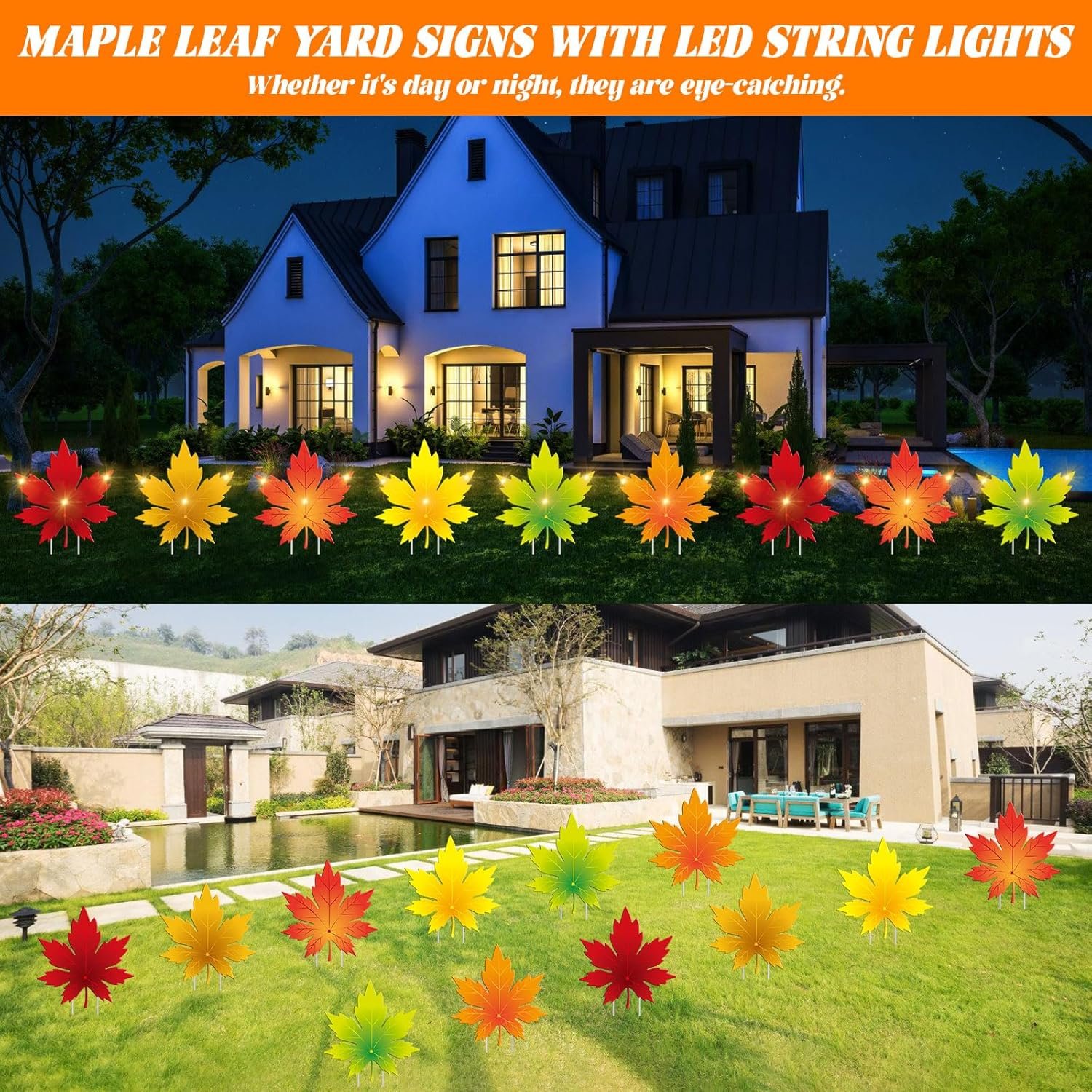 12 PCS 11.1”W*11.8H fall Maple Leaf Yard Signs with 24 pcs yard stakes, and 2 pcs 16.4 ft LED string lights.These fall leaves signs adopt the shape of maple leaves and bright fall leaf colors, wrapped with LED light strings.