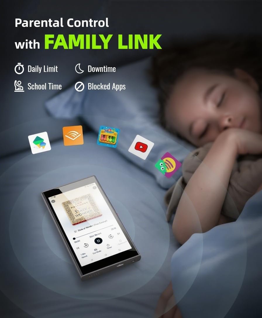 【Google Parental Controls】Family Link parental control is pre-installed on the music player as well, specially for kids and teenagers. The parents can set up time limits and schedules, block and unblock apps, active school time, etc. Don’t worry about unknown & unsafe resources and overuse.
