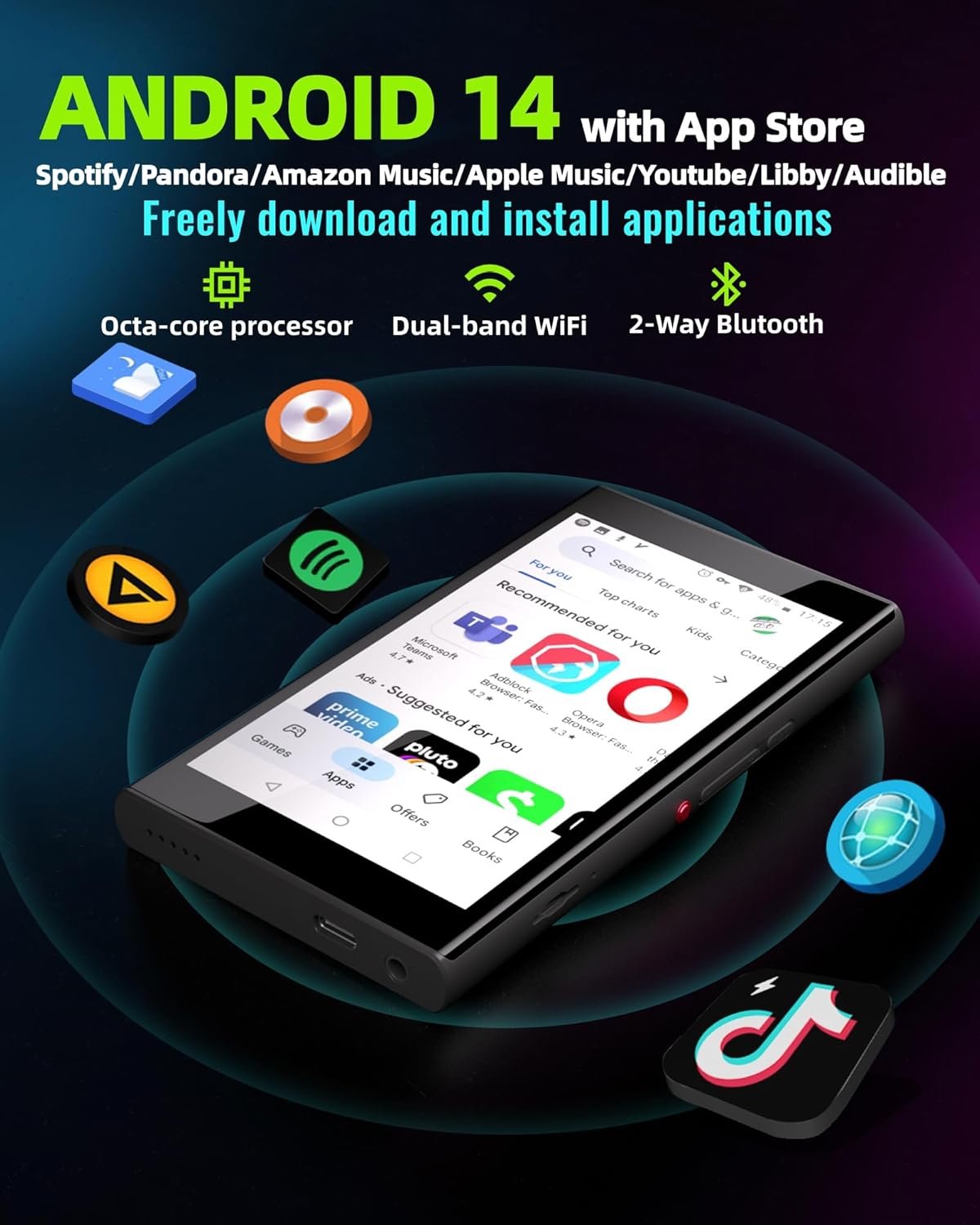 【Powerful Android 14 & Play Store】The Pecsu G5 (New Version) MP3 player features a high-performance octa-core processor that ensures smooth operation on the latest Android 14 system. Comes pre-installed with popular apps like Spotify, Pandora, Spotify Kids, Amazon Music, Libby, and Audible – all updatable and downloadable for free via the Play Store. Customize your experience by easily uninstalling unwanted apps or disabling pre-installed ones to free up memory and maximize storage space.