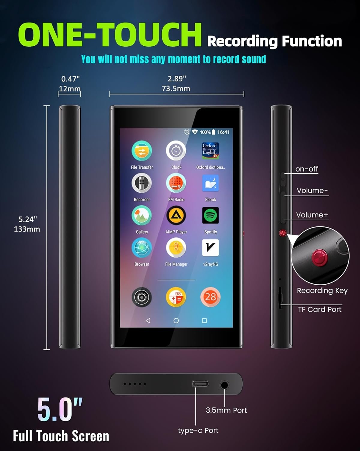 G5 mp3 player has a recording button. Press the red button for 2 seconds to start instant recording. It is easy to capture sound at any time.