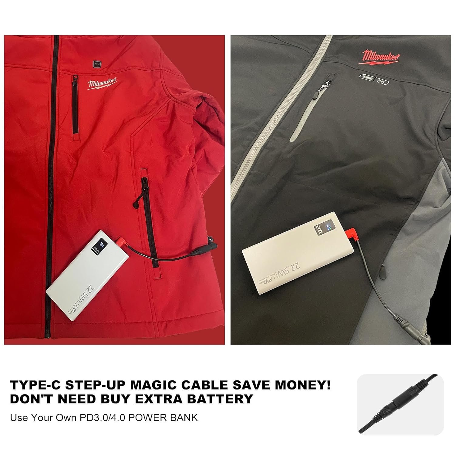 12V Heated Jacket Step-up Adapter Cable allows you to use your own existing QC 3.0 or PD function power bank to power your heated jacket, offering a budget-friendly solution for your outdoor and work needs. This Magic Cable can be as Replacement Heated Jacket Battery Pack designed to work with a variety of milwaukee heated Jacket battery, milwaukee m12 extended battery, Snap-on heated jacket battery, Revean jacket battery, 12v tool batteries and 12V heat jacket battery.