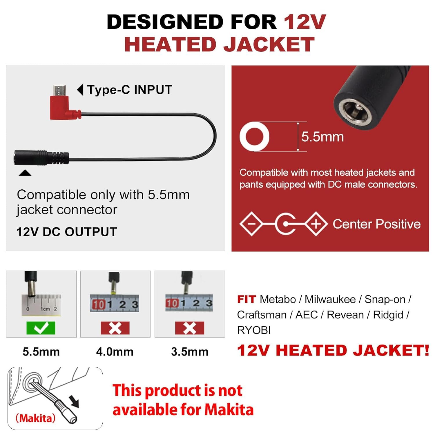 Q002. Why your Jacket cannot work with this Cable?? A002, The Heated Jacket Charger Cable connector size of this cable is 5.5mm. If your jacket’s connector is 3.5mm or 4.0mm, This Type C Heated Jacket Charger Cable won’t fit, and the Step-up Adapter Cable won’t work with your heating jacket. (Most 7.4V or 8.4V heated jackets use 3.5mm or 4.0mm connectors, which are incompatible with this 12V heated jacket step-up cable.)