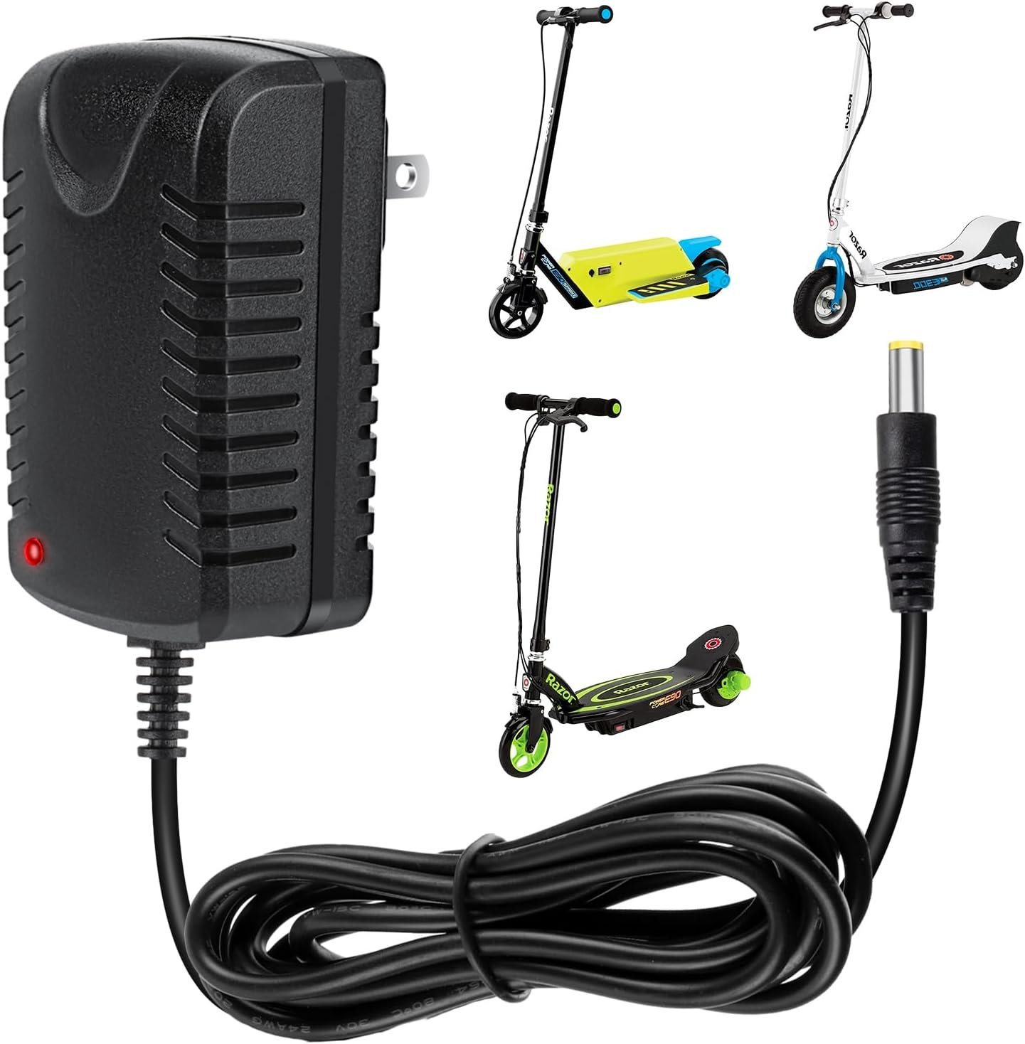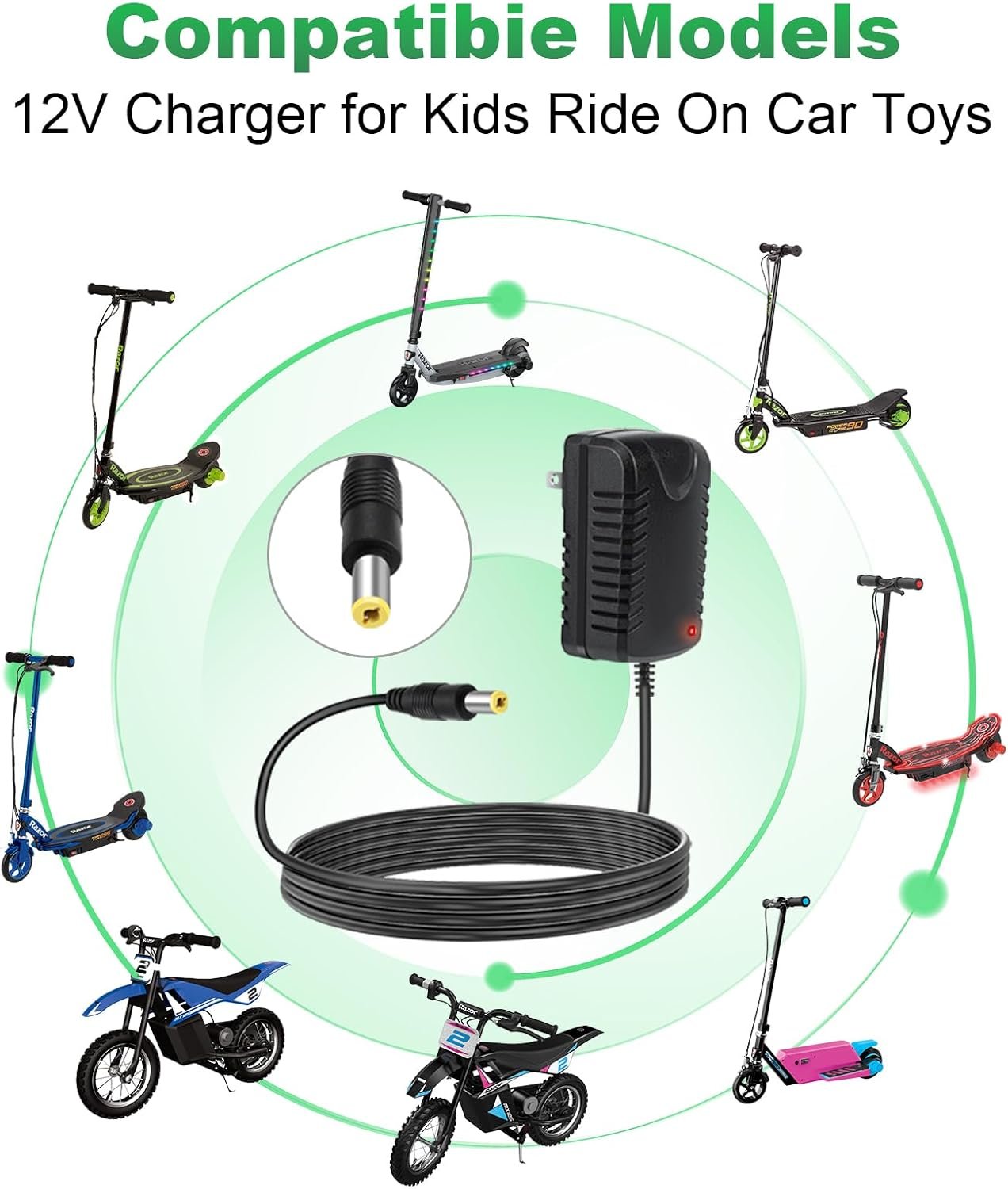 【12V Kids Ride On Charger Compatibility】: Support all Best Choice Products 12V round hole charging port Kids Electric Ride On Car, Kid Trax, Class 2, Bumper car, Razor power core E90 E95, power core 90 (glow), black label E90, power core E90 sprint, mx125 dirt bike, razor mx125 dirt rocket and more 12V Battery Charger for kids Ride On Electric Toys Cars