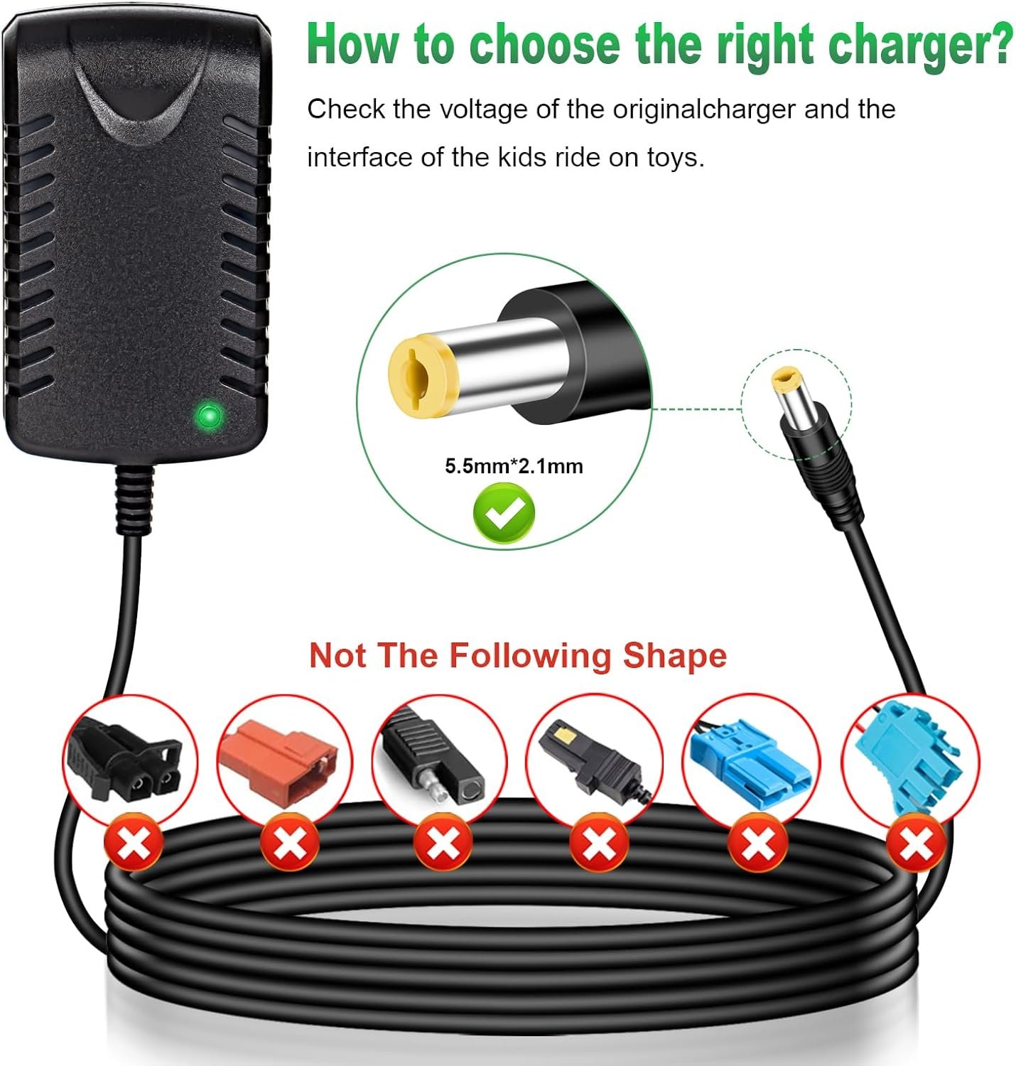 12V Charger Support all Best Choice Products, Wrangler, Kid Trax, Electric Ride On Cars Ferrari Lamborghini Mercedes BMX X6 Farm Tractor , Wrangler kids, Class 2, Kidzone Bumper car, Razor power core E90 E95, power core 90 (glow), black label E90, power core E90 sprint, mx125 dirt bike, razor mx125 dirt rocket and more 12V kids ride on car