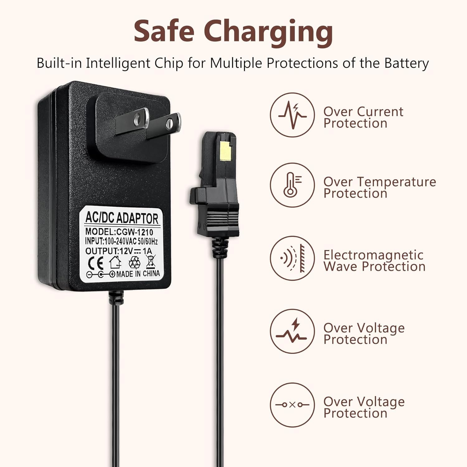 Specifications: 12v battery charger Input: 100-240V AC, 50/60Hz; Output: DC 12V, 1A. Features an intelligent IC chip that automatically detects when the battery is fully charged and switches to saver mode. Protects against overcharging, overheating, overcurrent, and short circuits to ensure safe and efficient charging