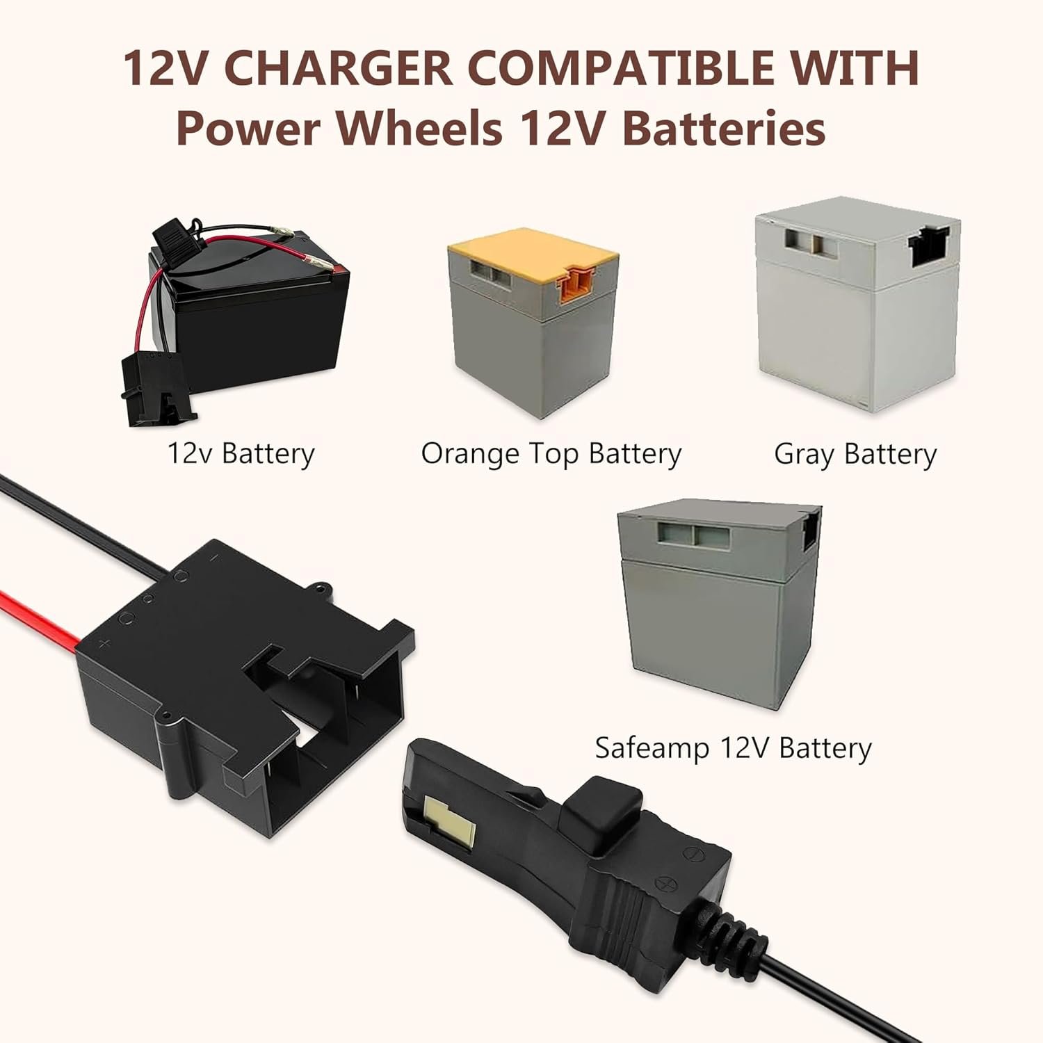 Compatibility: 12 volt battery charger Suitable for Fisher power wheels 12v battery gray and Orange Top Battery Item 1001175653, 00801-0638, 00801-1869,and SafeAmp 12V 9AH battery SA-PW12V, suitable for 12V batteries compatible with kids 12v ride on toys