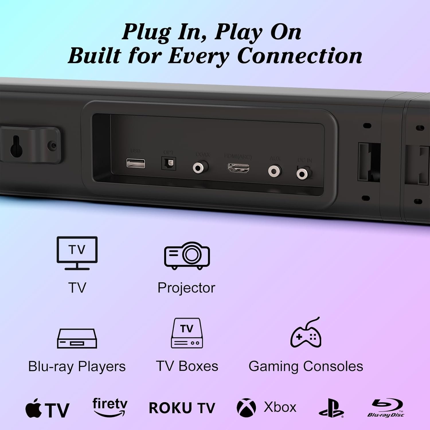 🔗𝗕𝗹𝘂𝗲𝘁𝗼𝗼𝘁𝗵 𝟱.𝟯 & 𝗩𝗲𝗿𝘀𝗮𝘁𝗶𝗹𝗲 𝗖𝗼𝗻𝗻𝗲𝗰𝘁𝗶𝘃𝗶𝘁𝘆–Effortlessly pair your devices via advanced Bluetooth 5.3 or connect through HDMI ARC, Optical, AUX, USB, or Coaxial inputs. Designed for modern home entertainment, it seamlessly works with smart TVs, projectors, PCs, and gaming consoles.