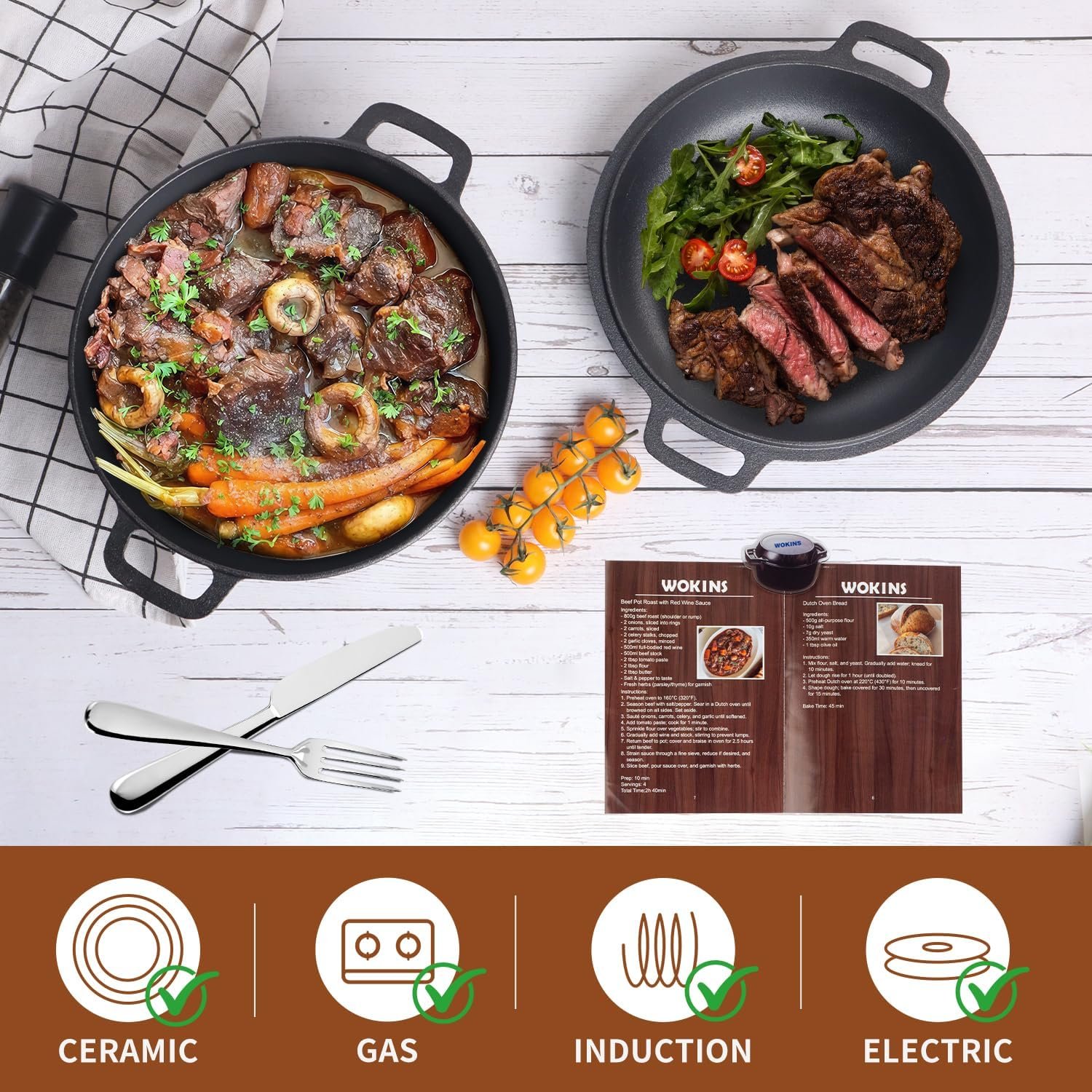 【Wide Usage Scenario】This cast iron cookware is suitable for food preparation and intended for household and outside use. It can be used on all common heat sources including:gas stoves,electric cooktops,halogen stoves,induction cookers,ovens,grills,etc.