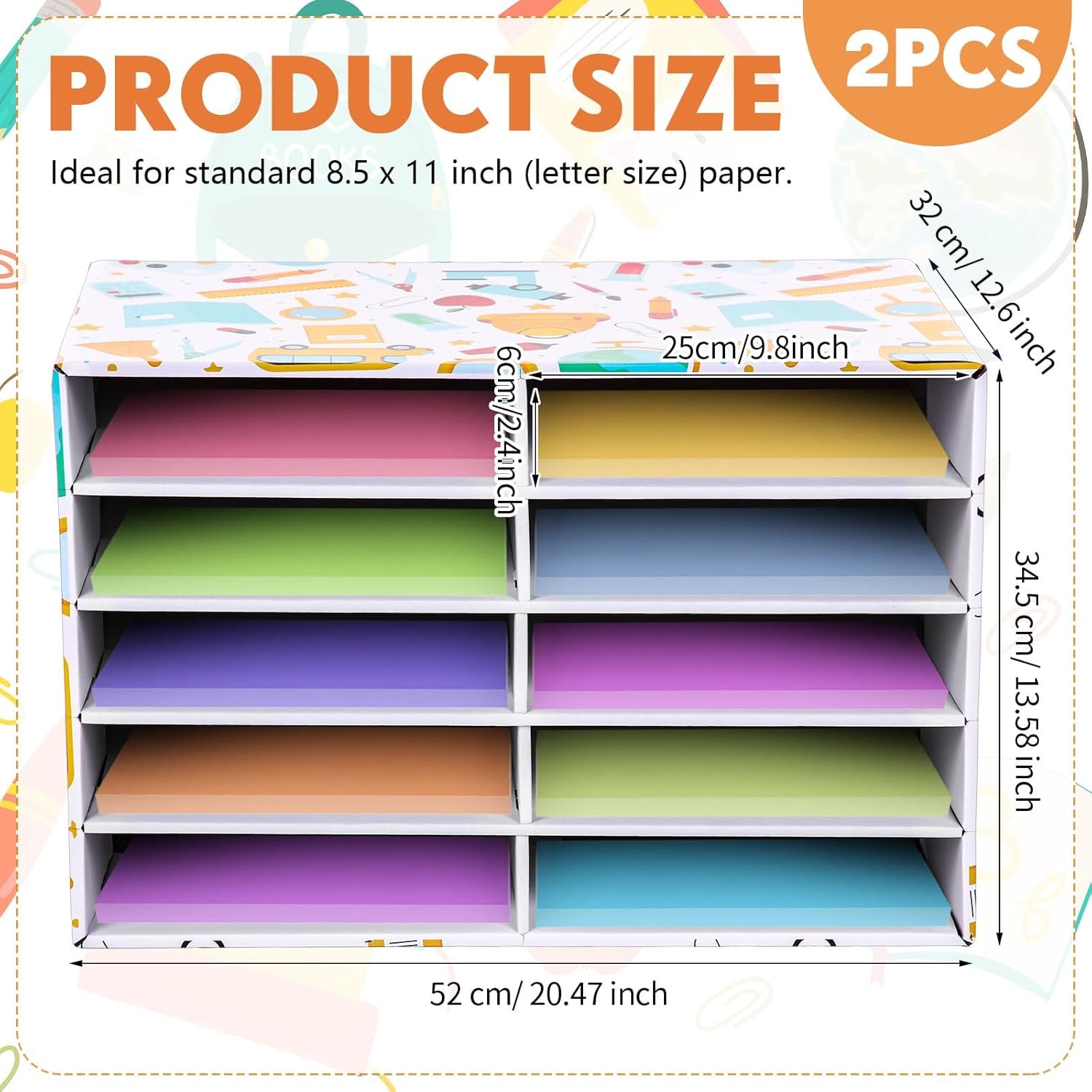 Size: the construction paper storage organizer measures about 19.7 x 12.4 x 11.8 inches/ 50 x 31.5 x 30 cm and provide 10 slots with each slot 2.4 inches/ 6 cm high and 25 cm/ 9.8 inches wide; It is 12.4 inches/ 31.5 cm in deep, ideal for standard 8.5 x 11 inch (letter size) paper, and large enough storage space allows you to store different papers and other materials in the order you want