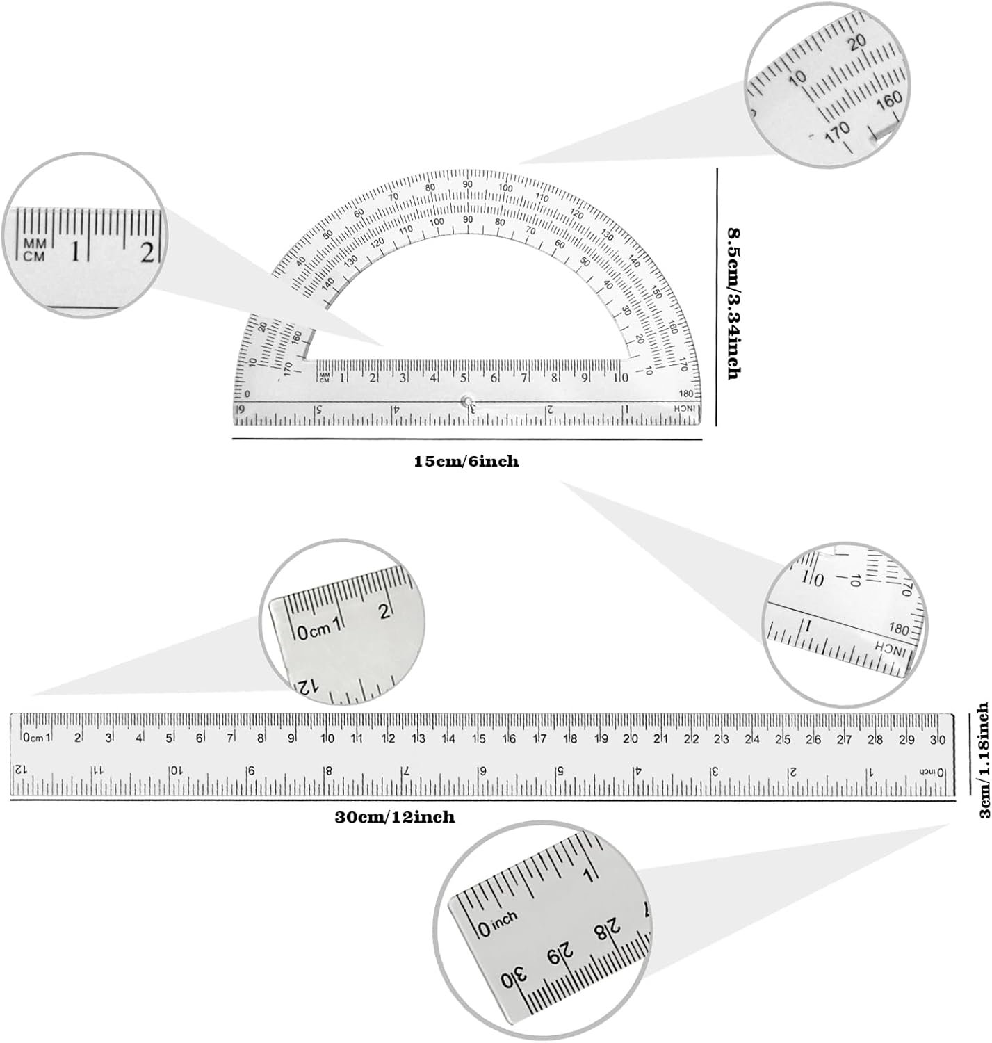 Proper Size for You to Carry: the length of the standard ruler is about 30.7 x 3 cm/ 12x 1 inch, the length of the protractor is about 15 cm/ 6 inches, the height is about 8.5 cm/ 3.35 inches; The size is appropriate, easy to carry, and you can put it in your stationery box or bag