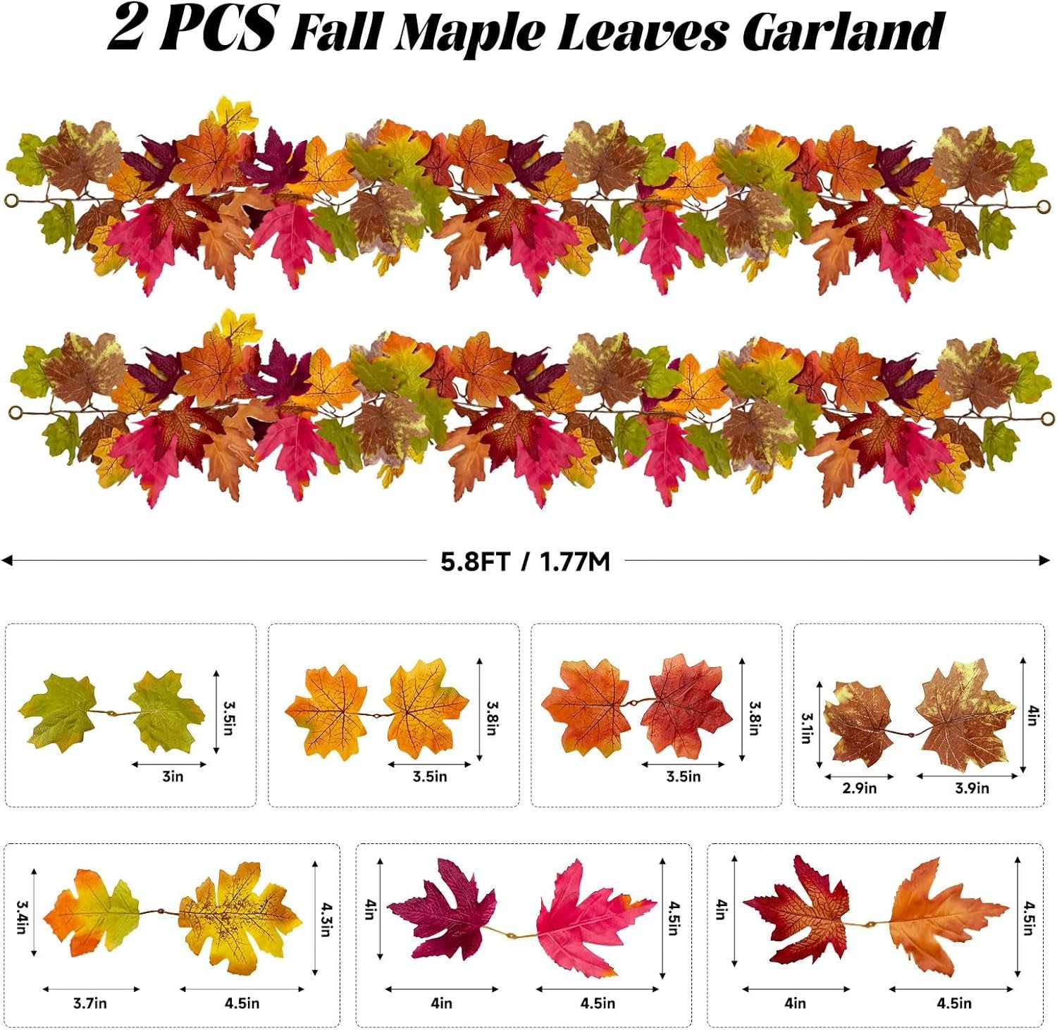 [Package Content]: 2 PCS 5.8 feet artificial maple leaf garlands (Purple,Brown,Green), and 4 PCS adhesive hooks for easy hanging. The purple,brown,green, orange, yellow, and red and more color maple leaves make for a great blend of colors to warm up any room.