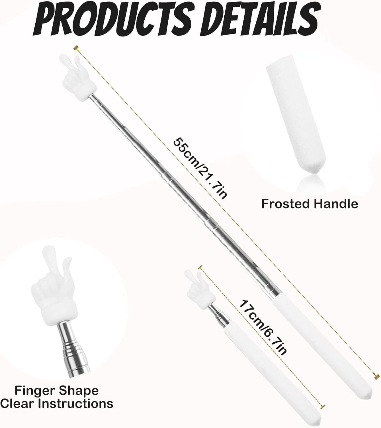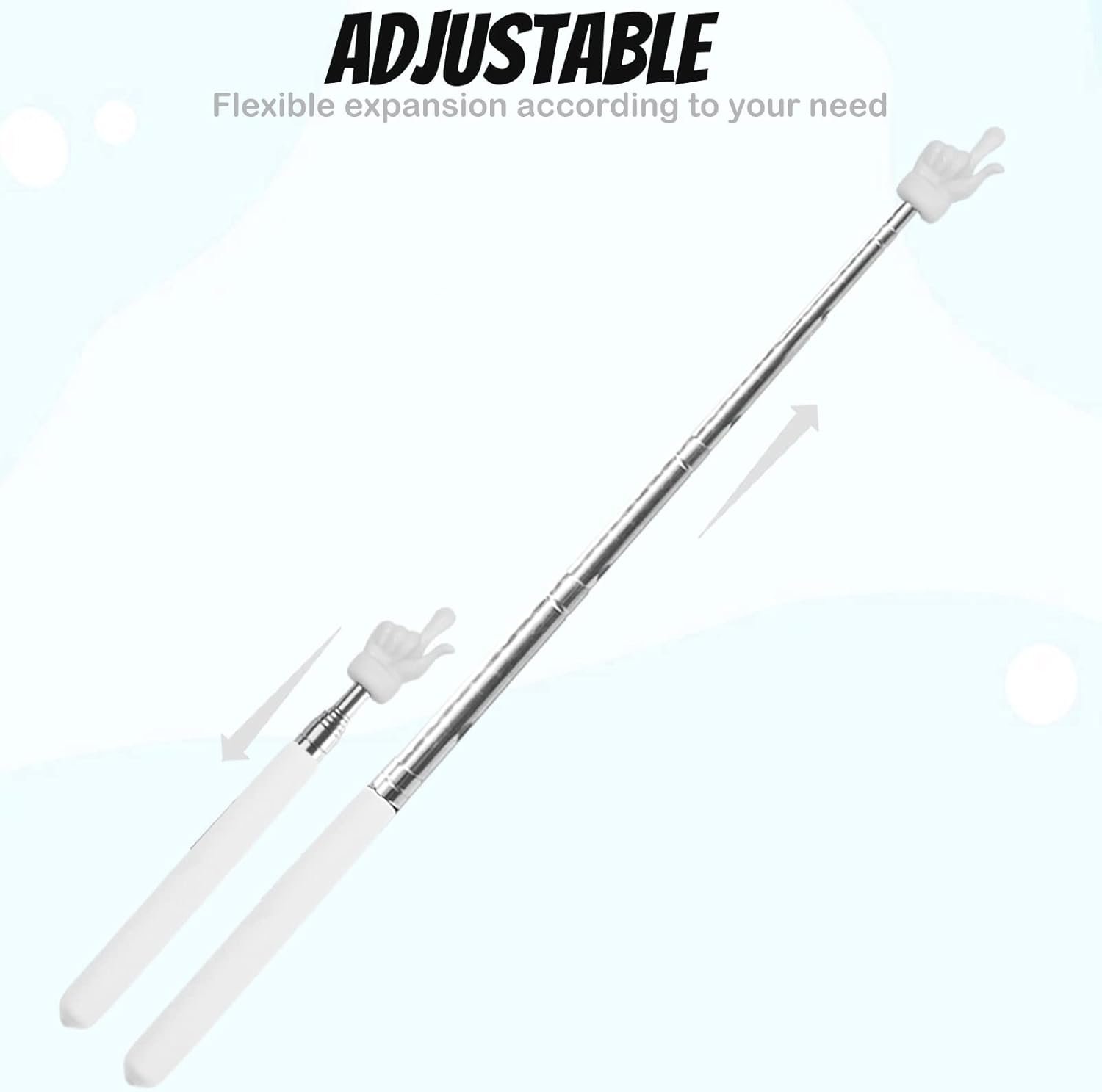 【 High-Quality Teacher Pointer】The classroom pointer is made of high-quality stainless steel, silicone, and plastic, which is comfortable to hold and can be used for a long time; plastic fingers will not hurt your blackboard or whiteboard; the stainless steel handle is strong and not easy to break, and it will not loosen when fully opened; the silicone handle is anti-skid, which is comfortable to grip.