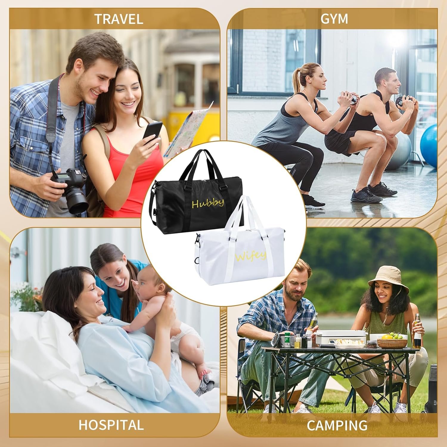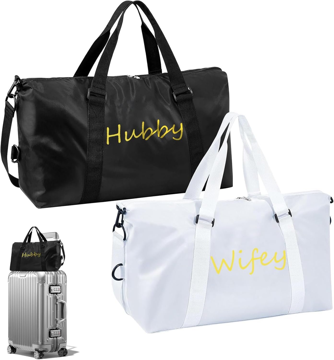 Complete Package: You will receive 2 pieces of wedding duffel bags in white and black, the “wifey” and “hubby” gold print styles are classic and fashionable, the quantity is enough to meet your daily use and replacement needs, bringing you convenience and ease