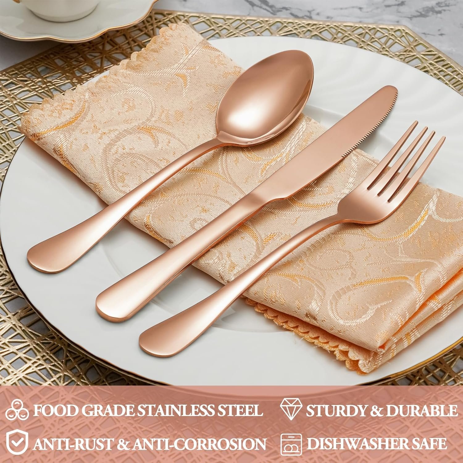 20 PCS ROSE GOLD SILVERWARE SET SERVICE FOR 4: This rose gold silverware set comes with 4 Dinner Forks, 4 Dinner Spoons, 4 Dinner Knife, 4 Salad/Dessert Fork and 4 Dessert/Tea Spoons, essential for families or restaurants. The set is also an irreplaceable dining tool whether it is for daily use or for preparing dinners or parties.