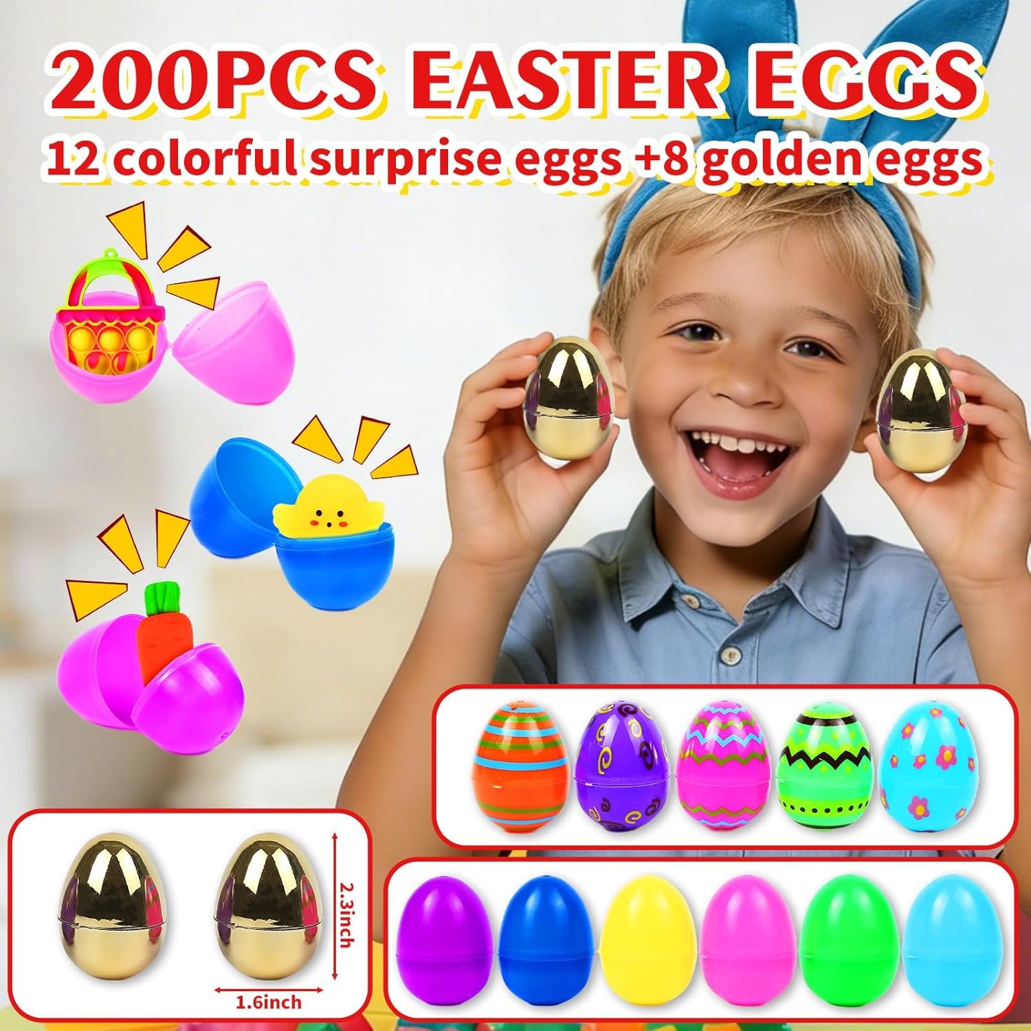 200 Pcs Prefilled Colorful Easter Eggs: The set has 200 one-piece plastic eggshells (4×6 cm), made of eco-friendly, high-quality non-toxic materials. Smooth edges, no redundant decorations, anti-break and anti-fade. 12 bright colors, including 180 surprise eggs,12 eggs with patterns, 8 golden eggs. Custom hinge ensures easy open, close and carry.