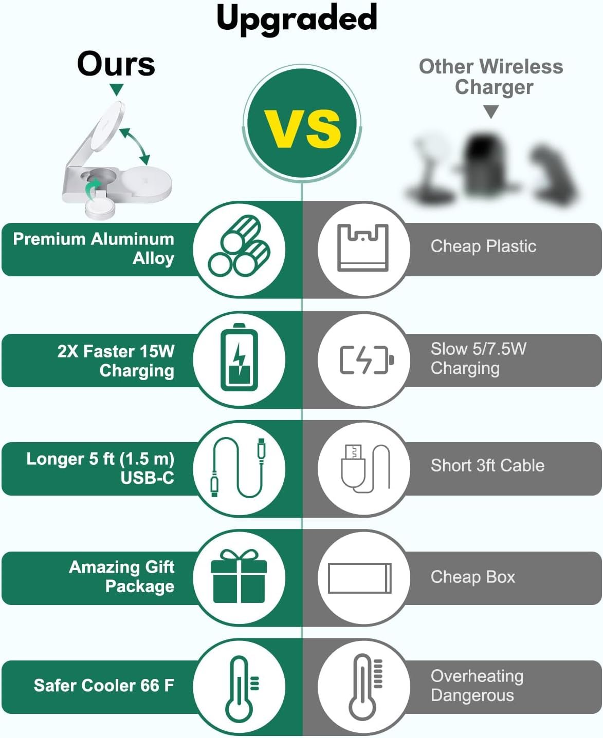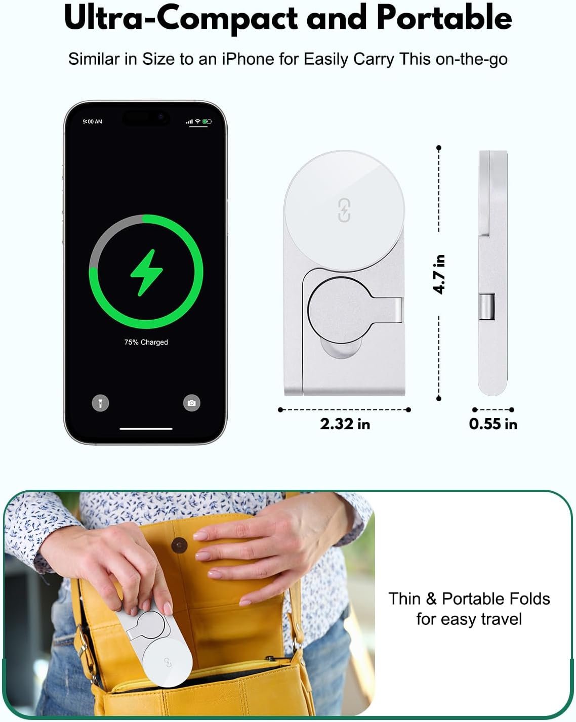🧳 Ultra-Compact & Foldable Design – Travel Ready Sleek, foldable, and incredibly portable, this 3-in-1 wireless charger is smaller than an Apple Magic Mouse, making it perfect for daily commutes, business trips, or vacations. The magnetic fold lets it slip easily into your pocket or bag without adding bulk.