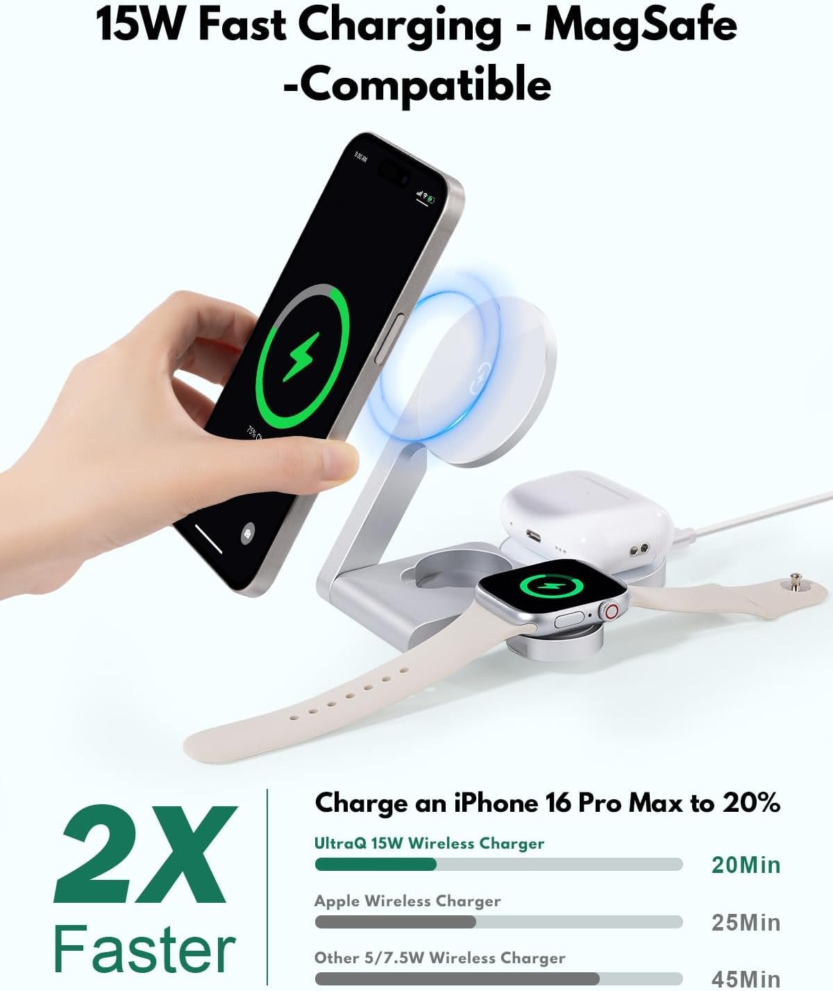 ⚡ 3-in-1 Charging for iPhone, Apple Watch & AirPods Simplify your desk setup with a space-saving wireless charging station that powers three Apple devices simultaneously – iPhone, Apple Watch, and AirPods. Enjoy tangle-free charging with clearly marked magnetic alignment zones for each device.