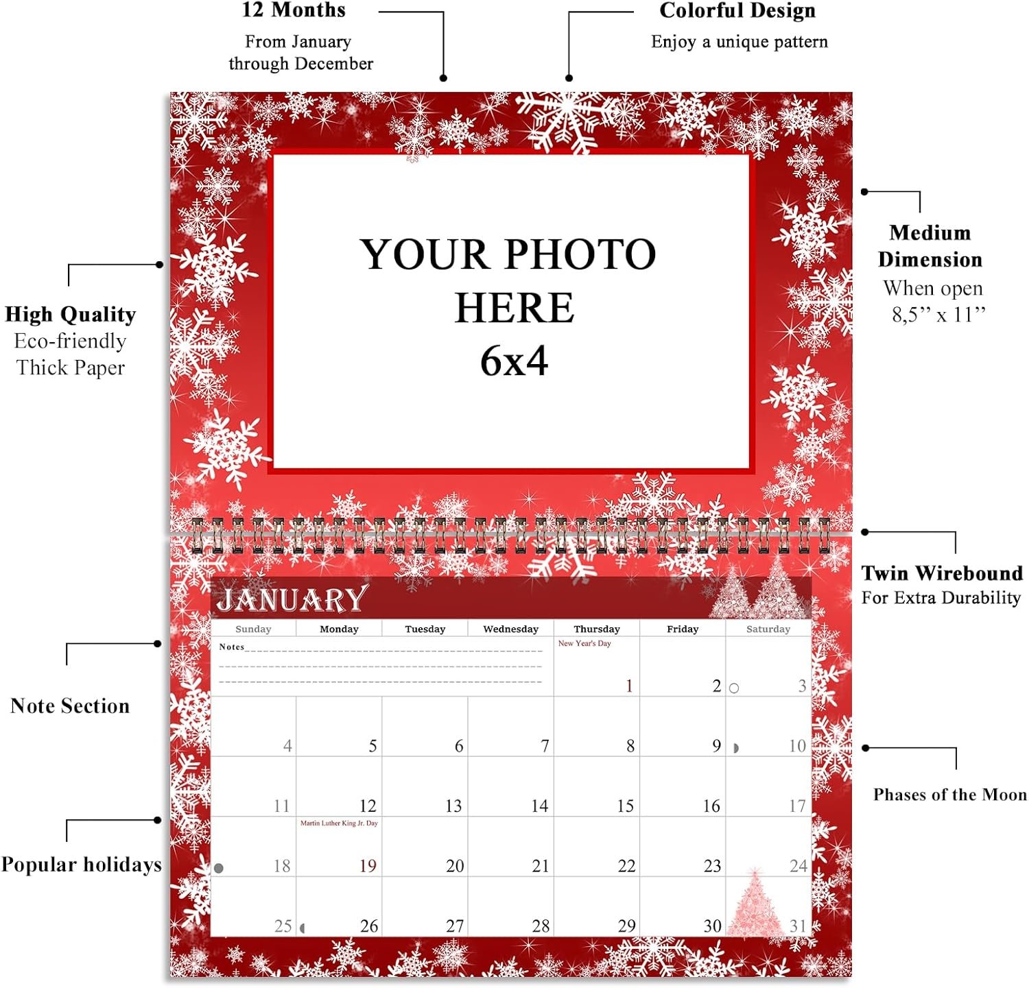 Uses 14 photos – Photo Size 4 x 6 in (1 cover photo & 13 monthly photos) for each calendar. Spiral bound top. Attach your own photos with Double-sided tape, glue dots or photo corners (not included must be purchased separately)