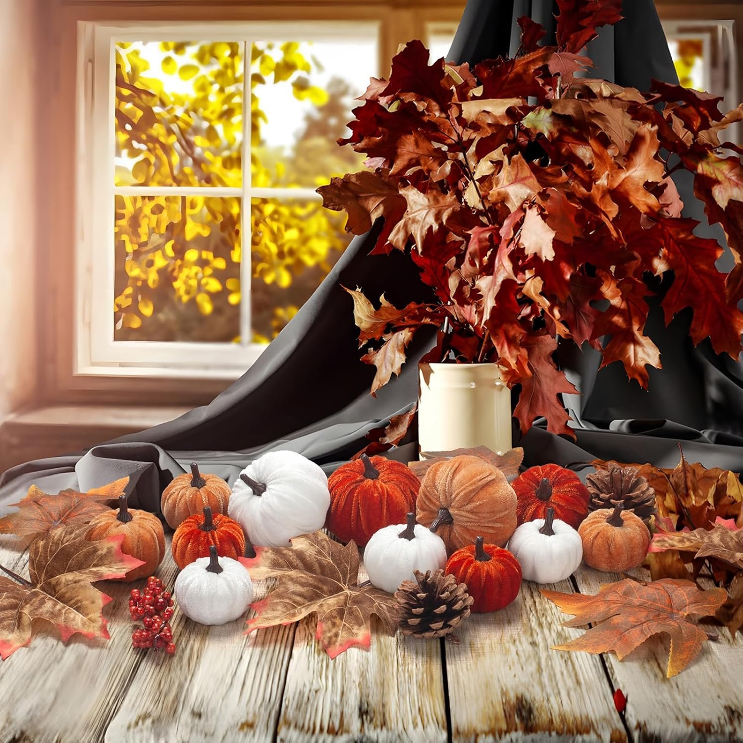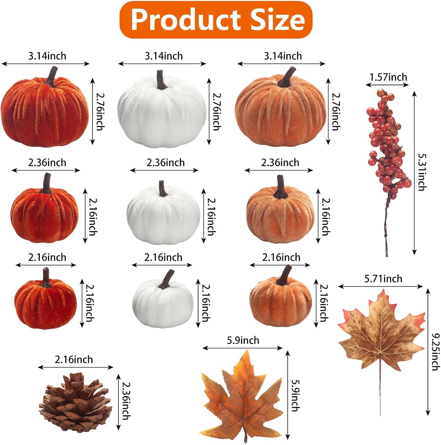 Package: 12pcs velvet pumpkins, 2 pine cones, 6 maple leaves, 1 berries, total 21pcs.Material: Made of premium materials foam and Velvet, our artificial pumpkins are built to last, ensuring reusability.Size:12 Pcs Assorted Sizes Rustic Harvest Velvet Pumpkins. With sizes ranging from 2.16 to 3.14 inches in diameter.Wide Application: Perfect outstanding decoration for Autumn, Wedding, Halloween, Thanksgiving, Christmas.