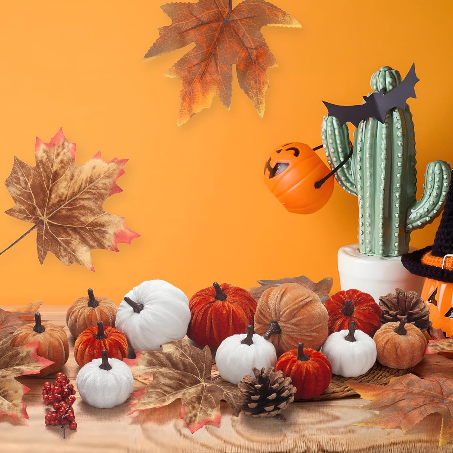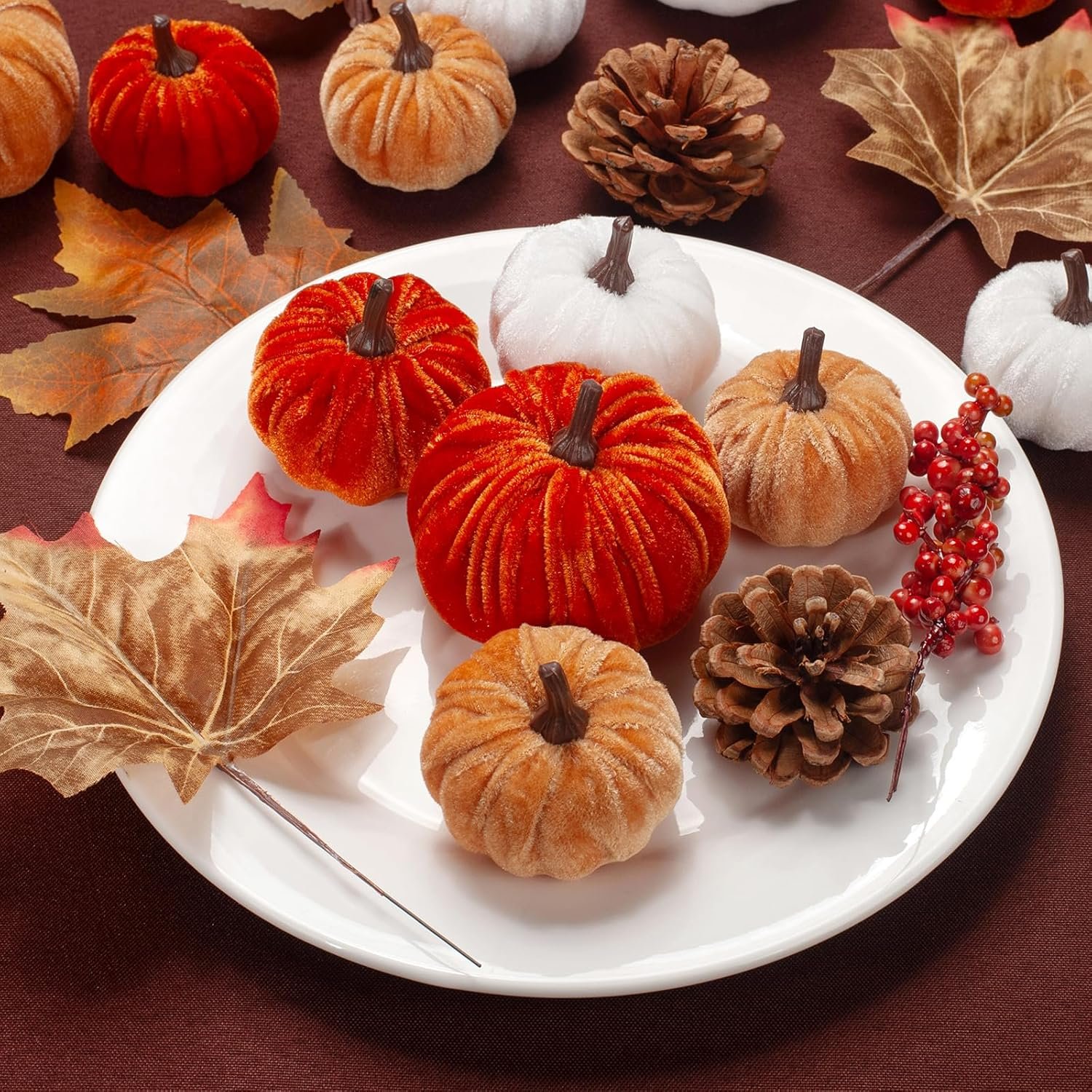 Velvet pumpkin sets assortment of iconic autumnal embellishments, great for centerpieces, Halloween Thanksgiving party decorations, embellish wreaths, or as a basket and vase filler. You can use your creativity to decorate your home and fill your home with the autumn atmosphere.