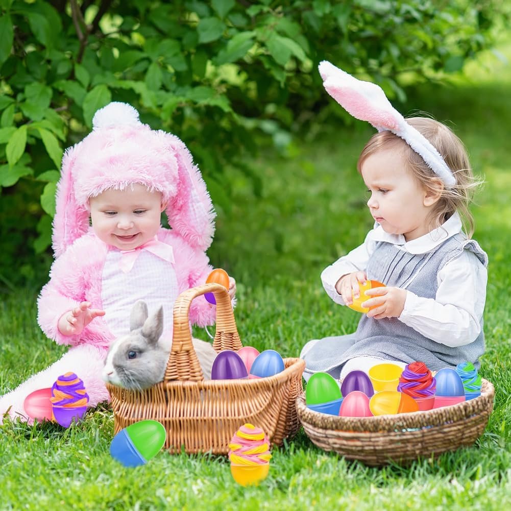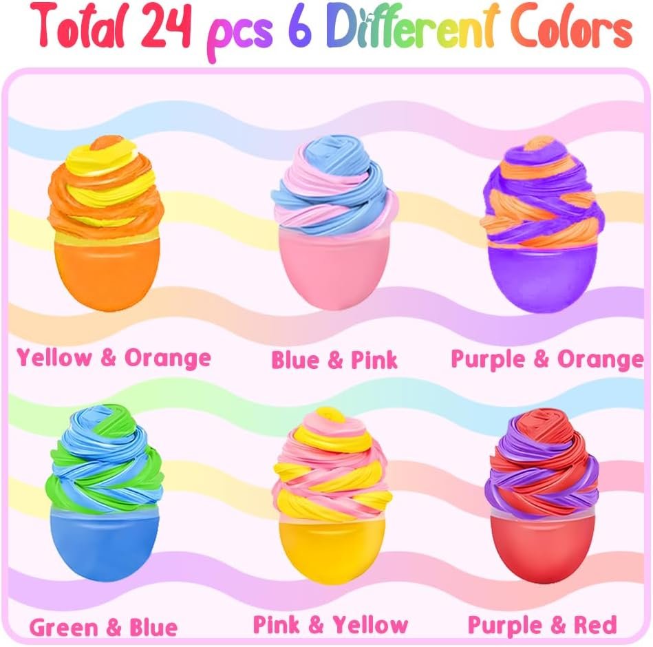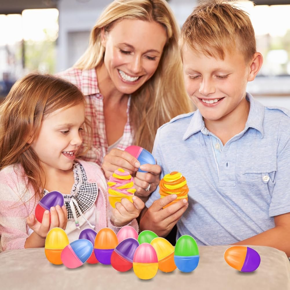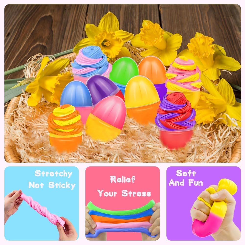 Pre-Filled Easter Egg Surprise: Includes 24 pre-filled plastic Easter eggs (2.4”x1.6”) stuffed with butter slime for instant Easter fun! Perfect for egg hunts, classroom activities, or party favors—kids will love discovering these squishy surprises.