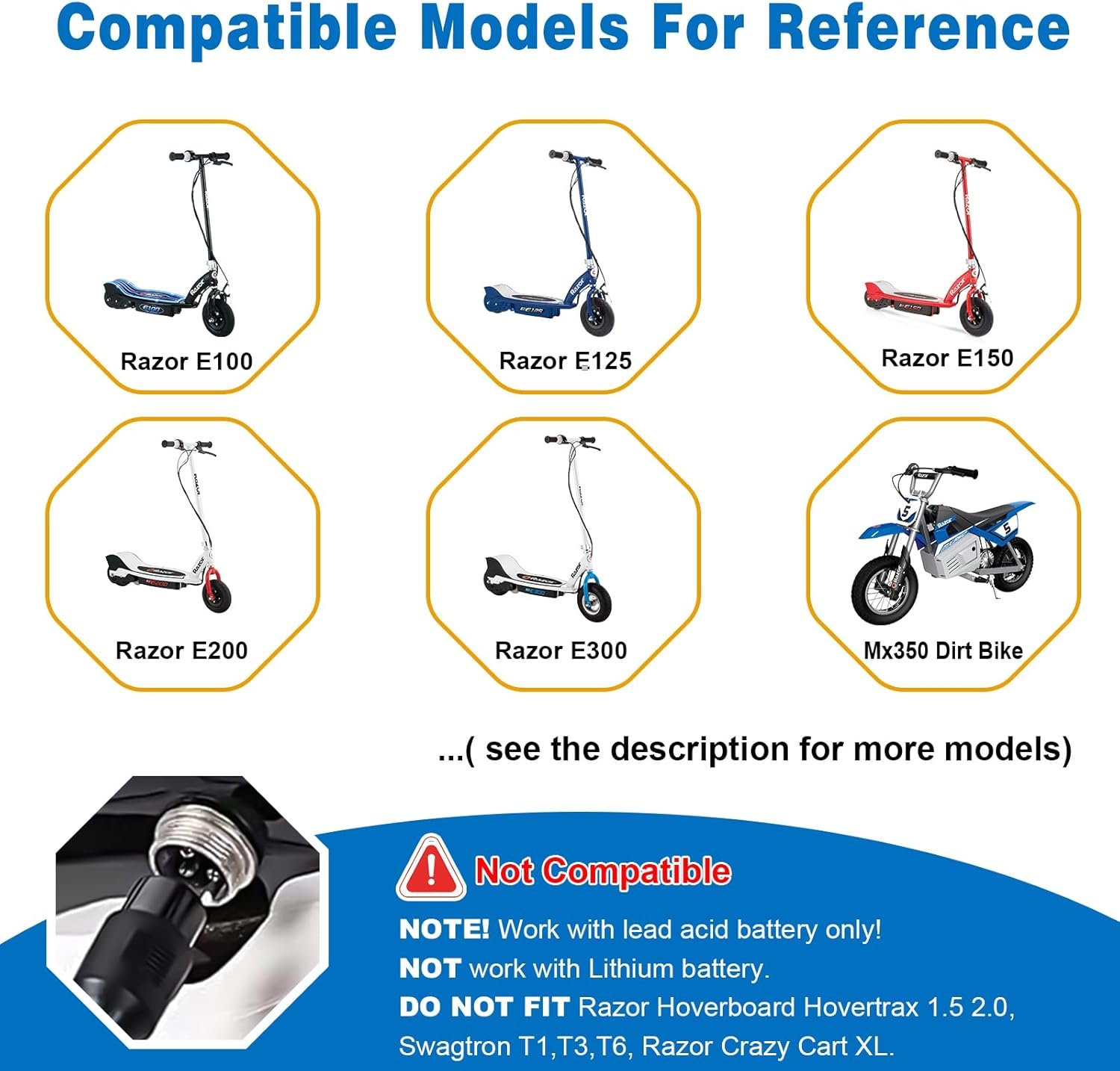 Note:24V Razor scooter charger replacement only 24V lead acid battery;Not For Hoverboard,Razor Hover,Hover Boards,Power Core E90,MX125,MX500,MX650,Pocket Mod Petite