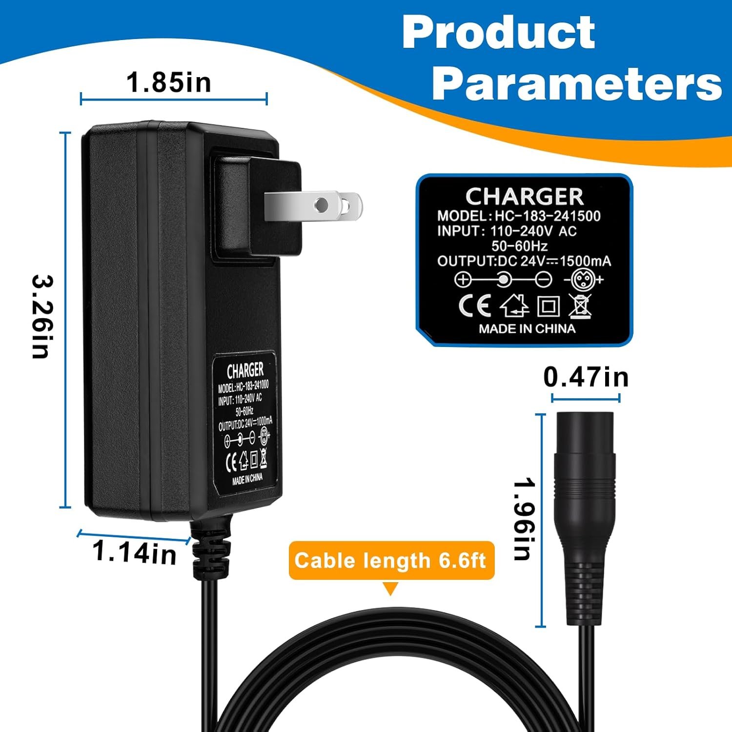24V Razor Charger Parameters: Output :24V 1500 mA ; Input: 110-240V; Interface: Standard 3-Prong; Length 6.6ft
