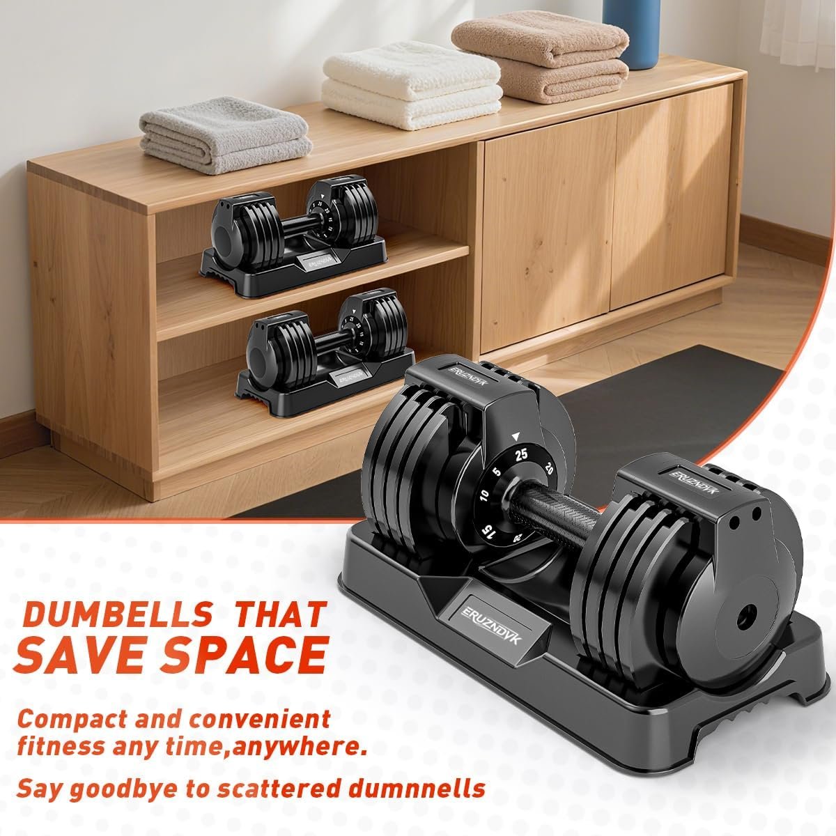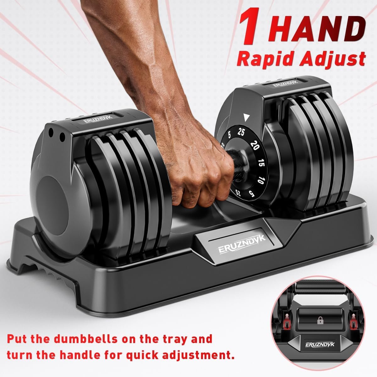 5-in-1 Adjustable Weights: This set offers adjustable dumbbell weights ranging from 5 to 25 lbs in 5 lb increments via a dial (including 5, 10, 15, 20, and 25 lbs). It replaces five traditional dumbbell sets, providing versatile strength training for your home gym.