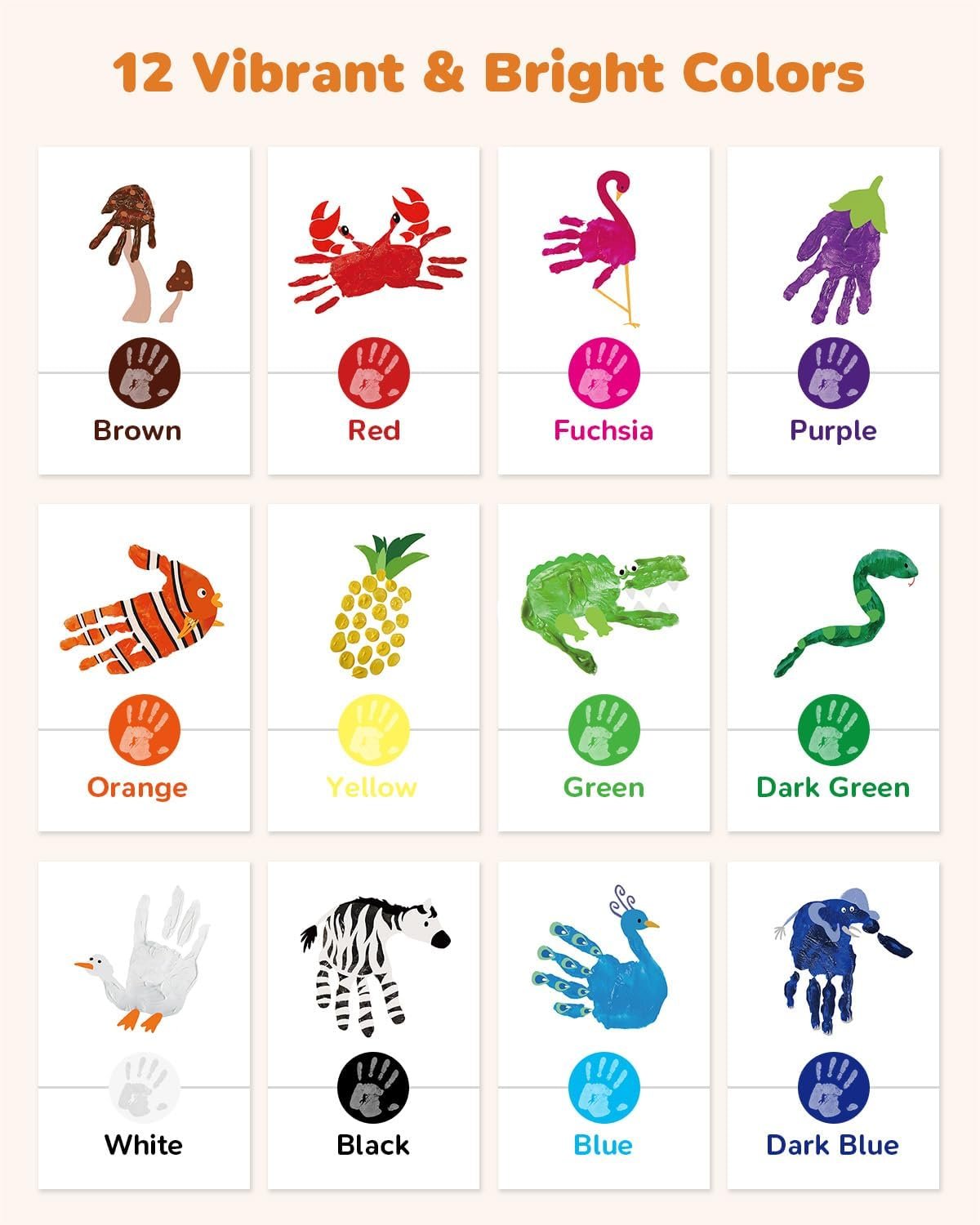 Yes, the JUPITEARTH Washable Finger Paint set features 12 vibrant colors.Each bottle features playful animal and fruit icons to spark shape recognition.