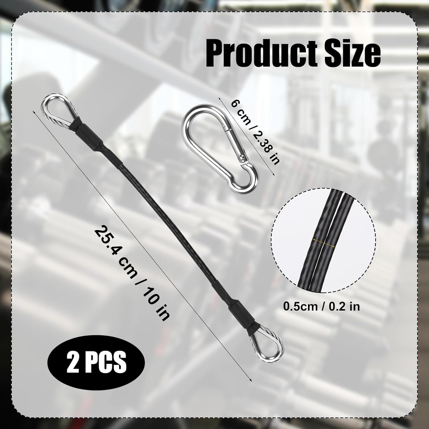 Size Information: The home gym cable extension is about 10 inch/25.4cm long; the carabiner is about 2.38 inch/6cm long.