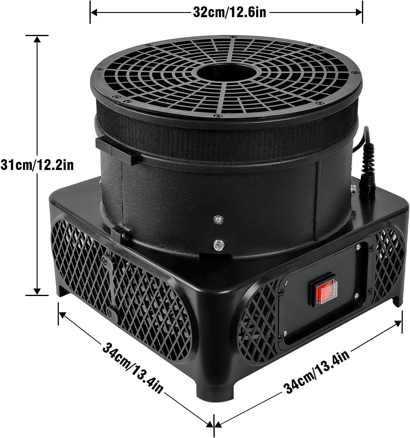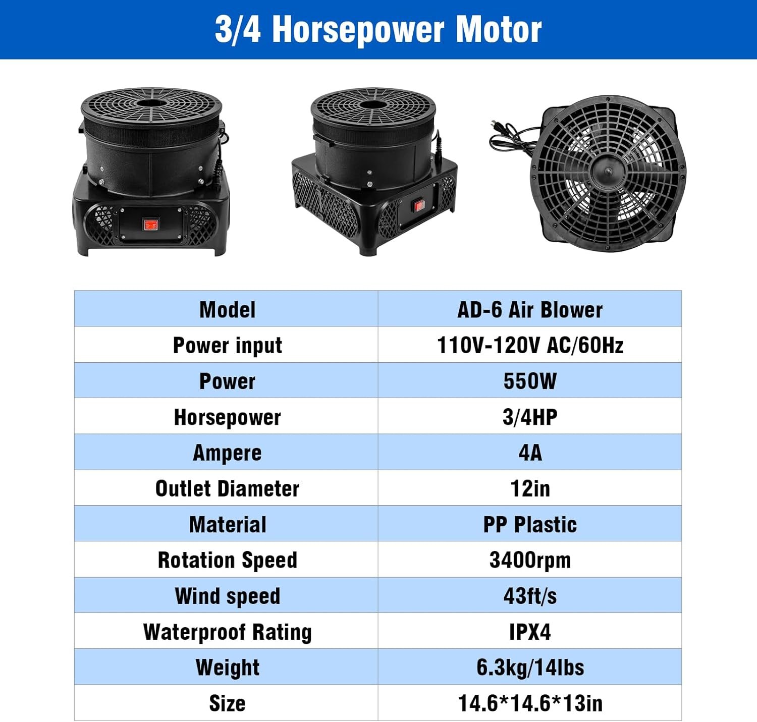 Product Specifications: Voltage 110V/60Hz, power 3/4HP (550W), suitable for inflatable dancers with a diameter of 12in