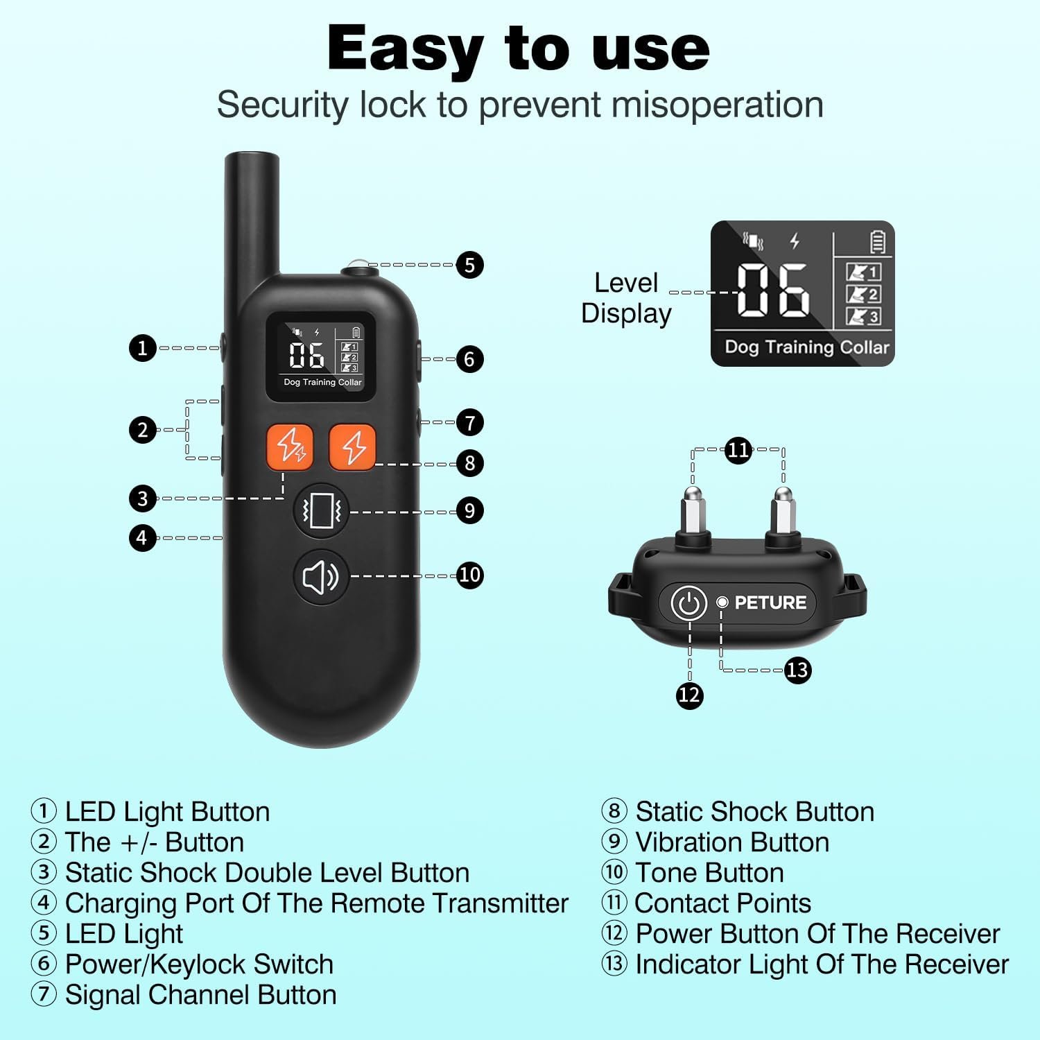 Safety Lock & Flashlight: Equipped with a safety lock to prioritize training safety, preventing accidental shock or misoperation when the remote is in a bag or pocket. The LED light on the remote control enhances nighttime visibility, making it easy to locate your dog in the dark