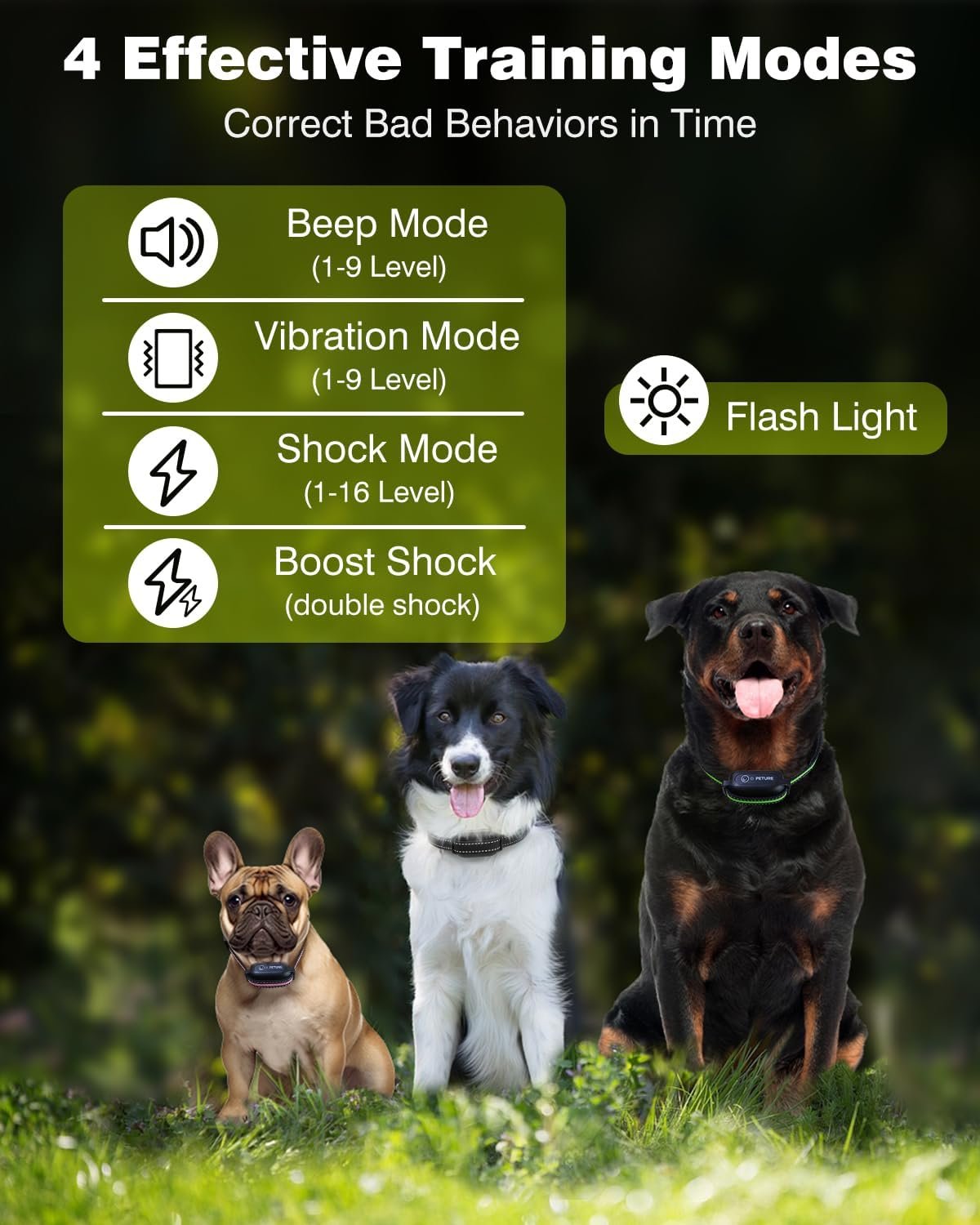 5 Adjustable Training Modes: This durable dog shock collar offers 5 humane operating modes: Beep (Levels 1-9), Vibration (Levels 1-9), Safety Shock (Levels 1-16), Flashlight, and Double Shock specifically designed for training large dogs