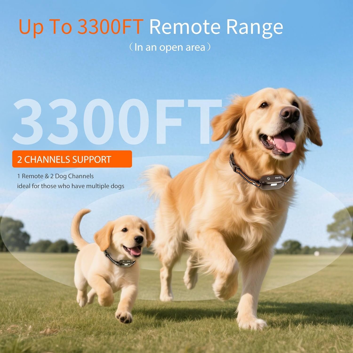 Up to 3300FT Range & 3 Channels: The dog training collar has a control range of up to 3300 feet, enabling you to train your dog indoors or outdoors. With dual-channel, one remote supports 3 receiver collars, and you can train 3 dogs at the same time! Besides, it has a memory function without resetting it.