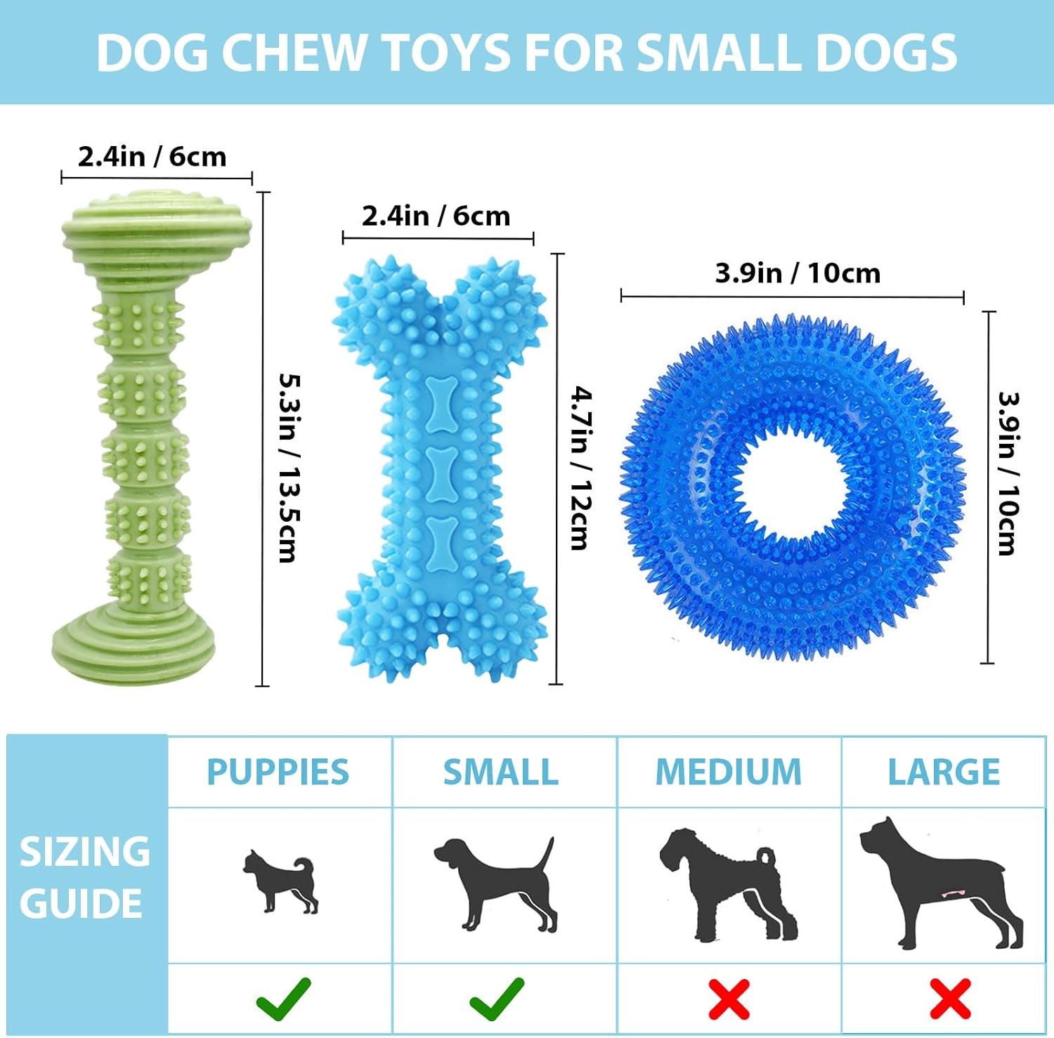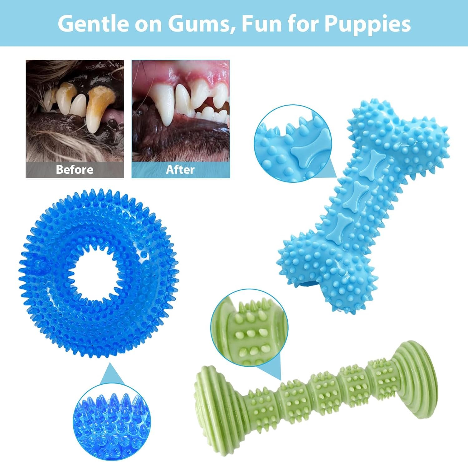 Bone-Shaped Dumbbell Toy: Designed to fit comfortably in your puppy’s mouth, this toy helps clean teeth and massage gums while they chew.