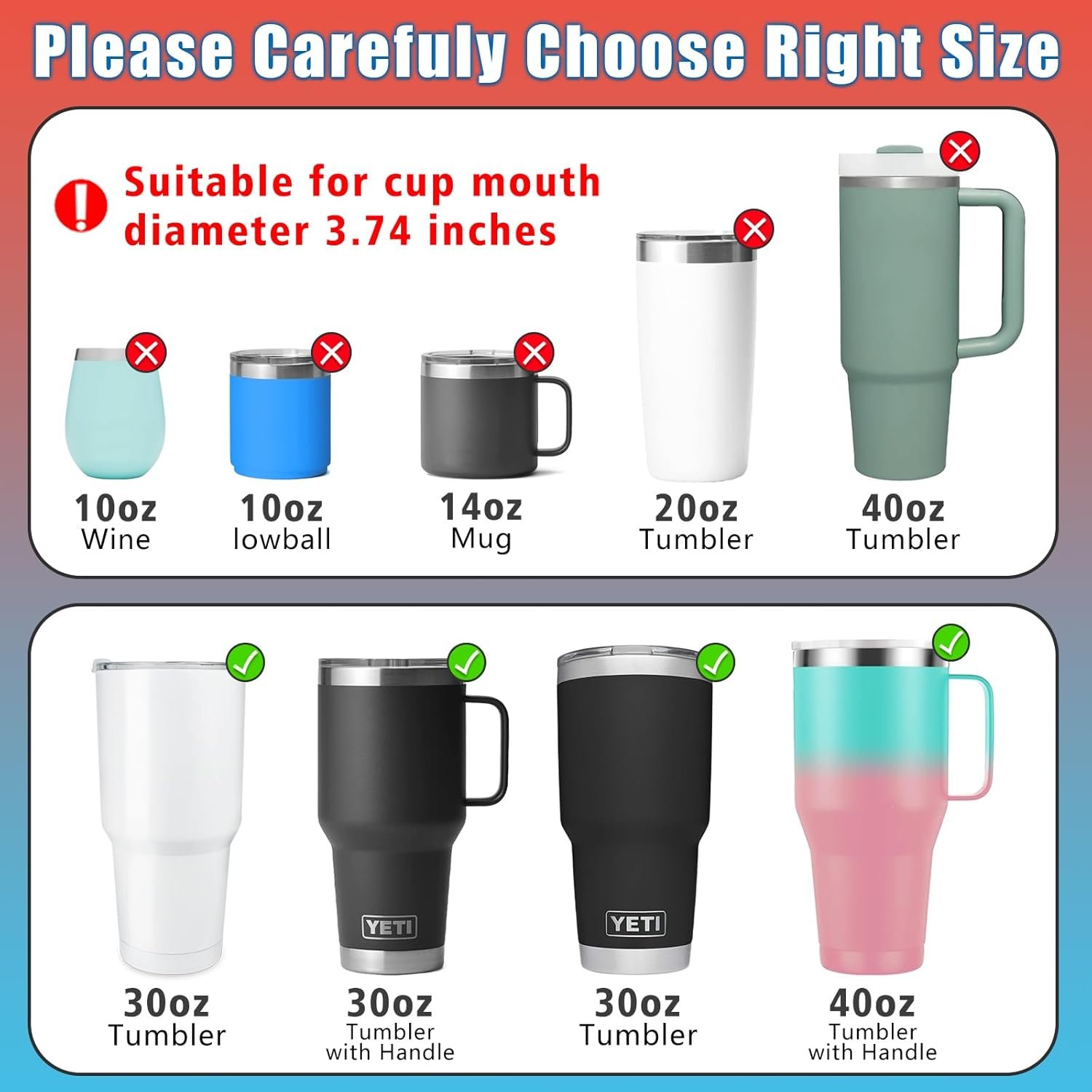 Perfect Fit: The 30oz replacement lid fits tumblers with an inner diameter of 3.74 IN, suitable for Yeti Rambler, Old Style RTIC, SUNWILL tumblers, if you need other brands, please check the size carefully before buying to make sure Your tumbler perfect fit.