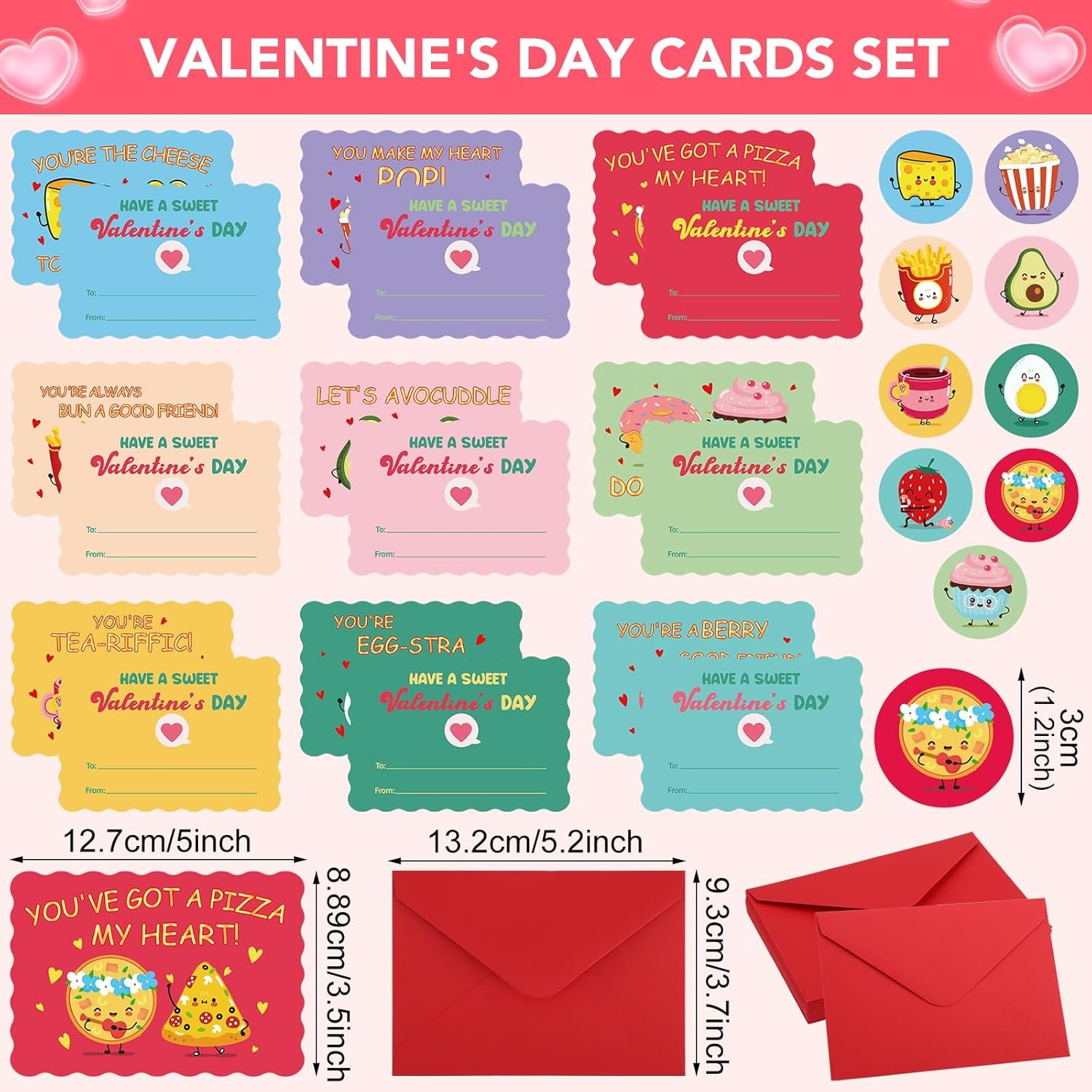Valentine Card Set — You’ll receive 36 Valentines day cards (9 designs, 4 of each), 36 red envelopes, and 36 stickers (9 designs, 4 of each). A complete and practical valentine’s day card set that makes it easy for kids to share Valentine’s greetings with classmates, break the ice, and build friendships.