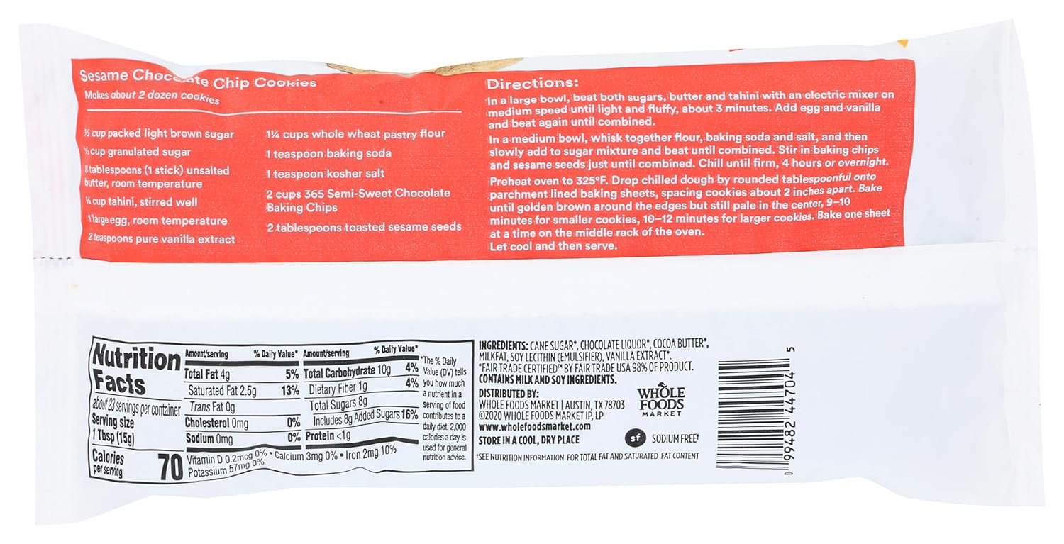 Who are we? Well, we seek out the finest natural and organic foods available, maintain the strictest quality standards in the industry, and have an unshakeable commitment to sustainable agriculture. We ban 300+ ingredients from all food that we sell, including hydrogenated fats, high-fructose corn syrup and sweeteners such as aspartame, sucralose and saccharin, so you can skip deciphering ingredient labels and cut to relishing your finds. All of our chocolate bars, chocolate chips and baking chocolate products sold under our 365 by Whole Foods Market brand are certified by Fair Trade USA or Fair Trade International.