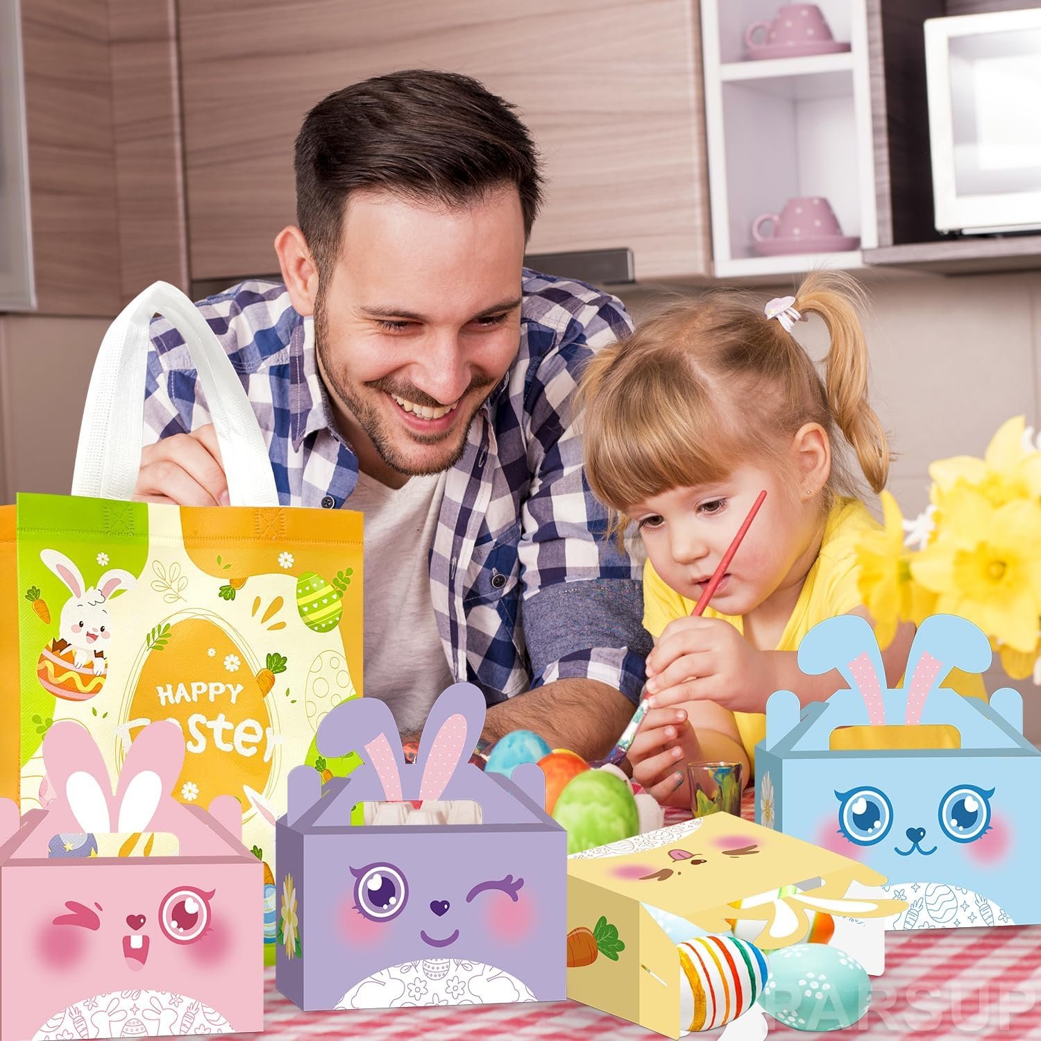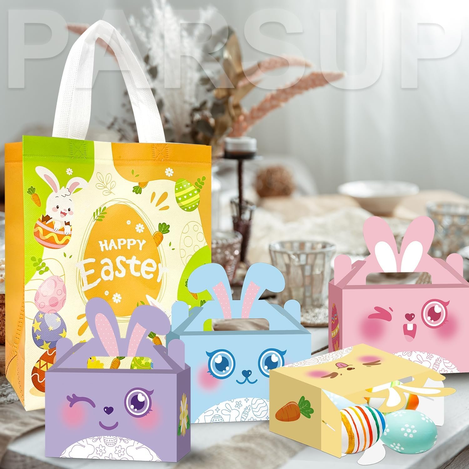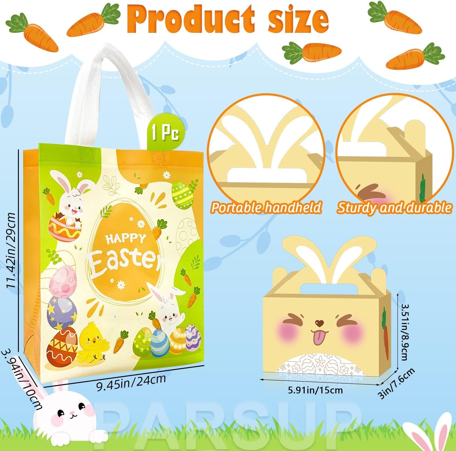 Perfect Size – The Happy easter treat box is 15 x 8.9 x 7.6 cm/ 6 x 3.5 x 3 inch, appropriate size for you to put in some small gifts and homemade cupcakes, also nice for filling with party favors at your Easter Day celebration. And the easter gift bag measures 29 x 24 x 10 cm/ 11.42 x 9.45 x 3.94inch, perfect for gift wrapping & easter egg hunt activities.