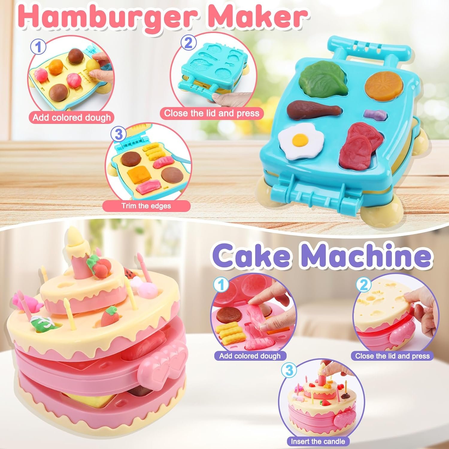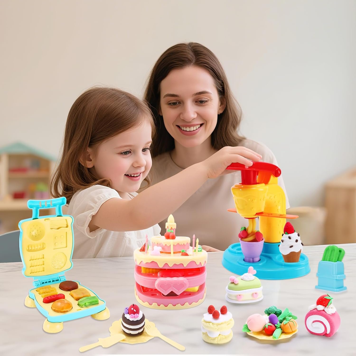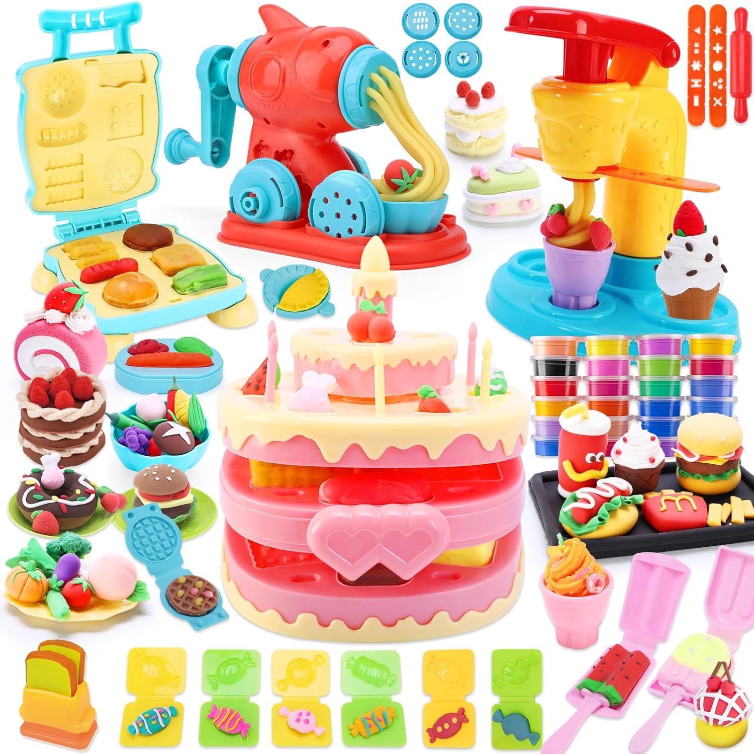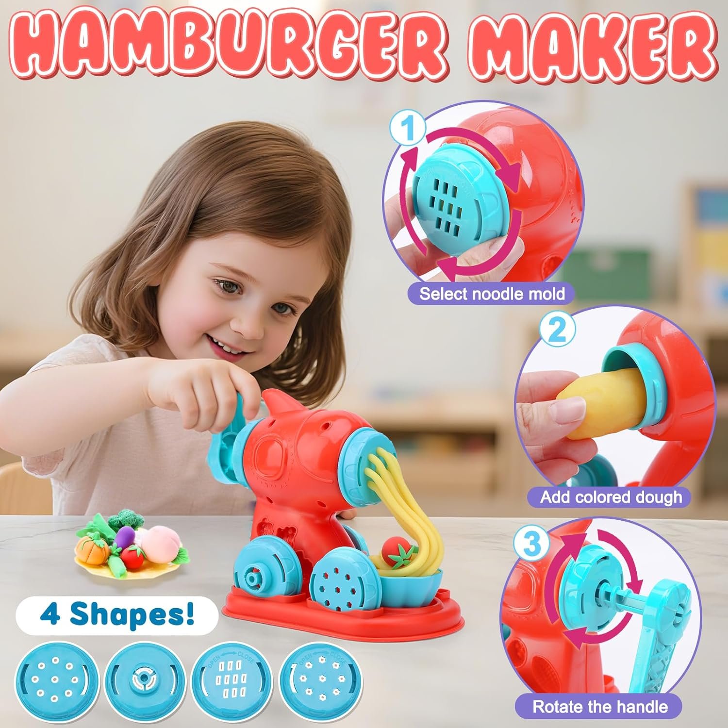 All-in-One Creative Playset: The 4-in-1 color dough set features four exciting tools: a noodle maker, cake maker, hamburger maker, and ice cream maker, allowing kids to explore various culinary creations.
