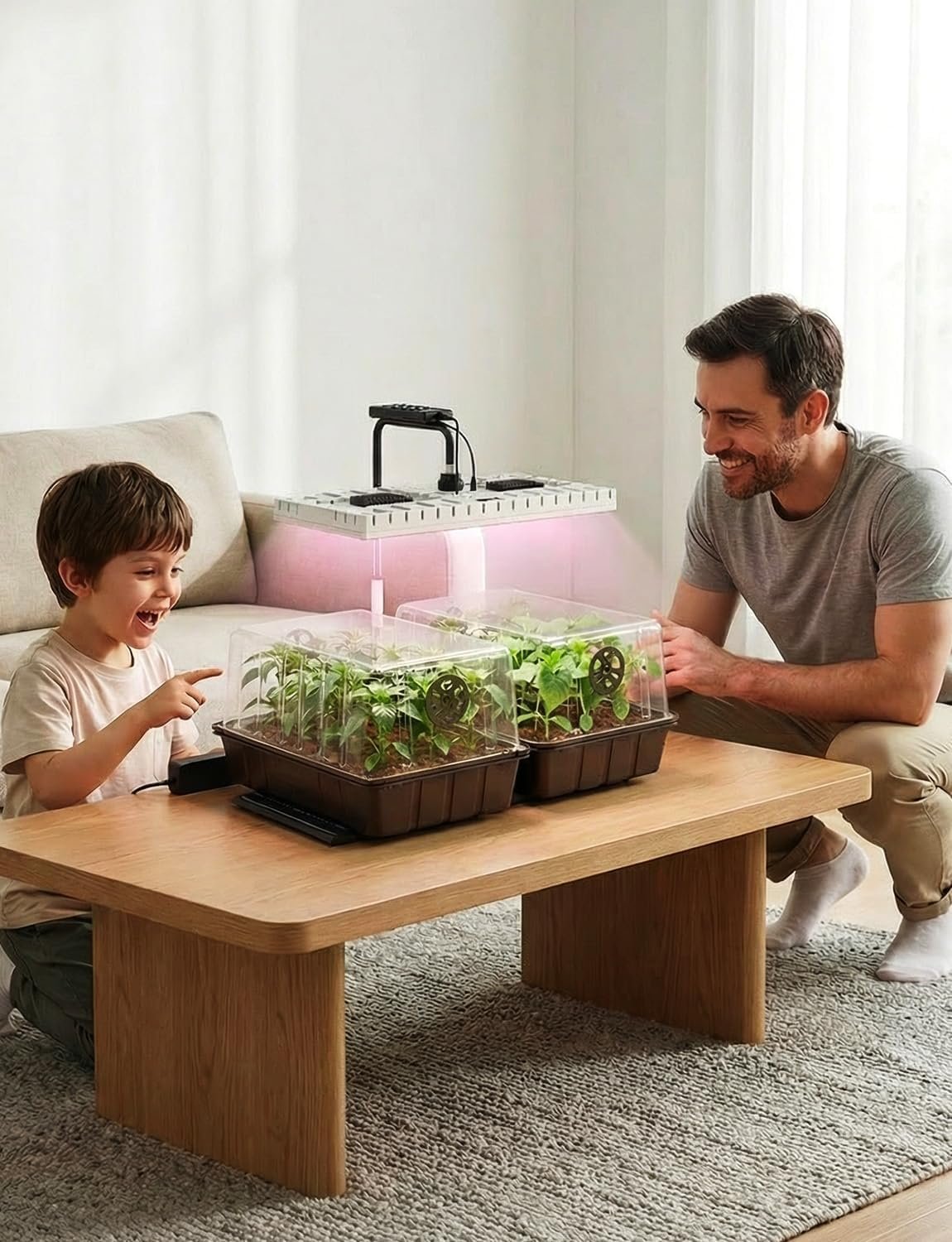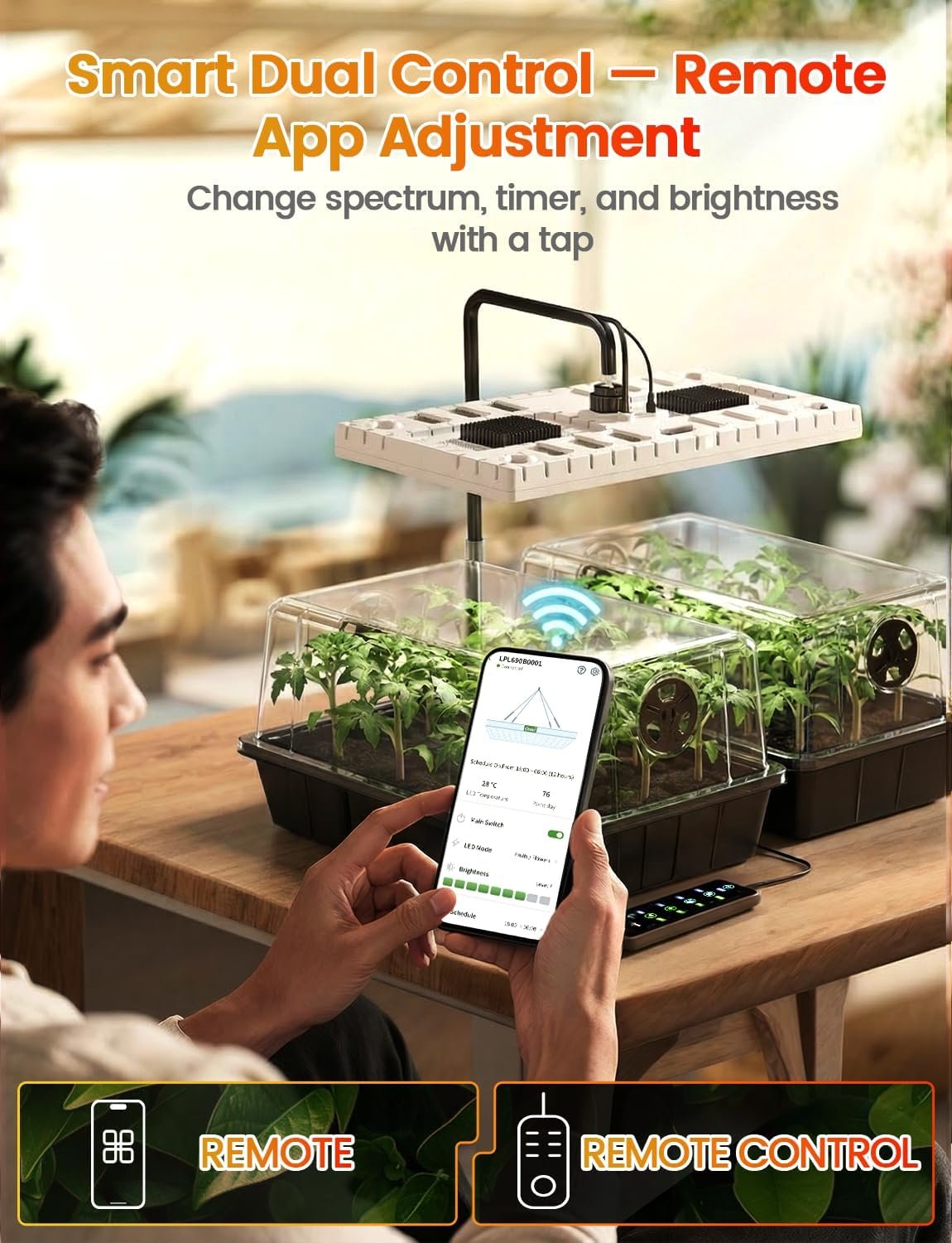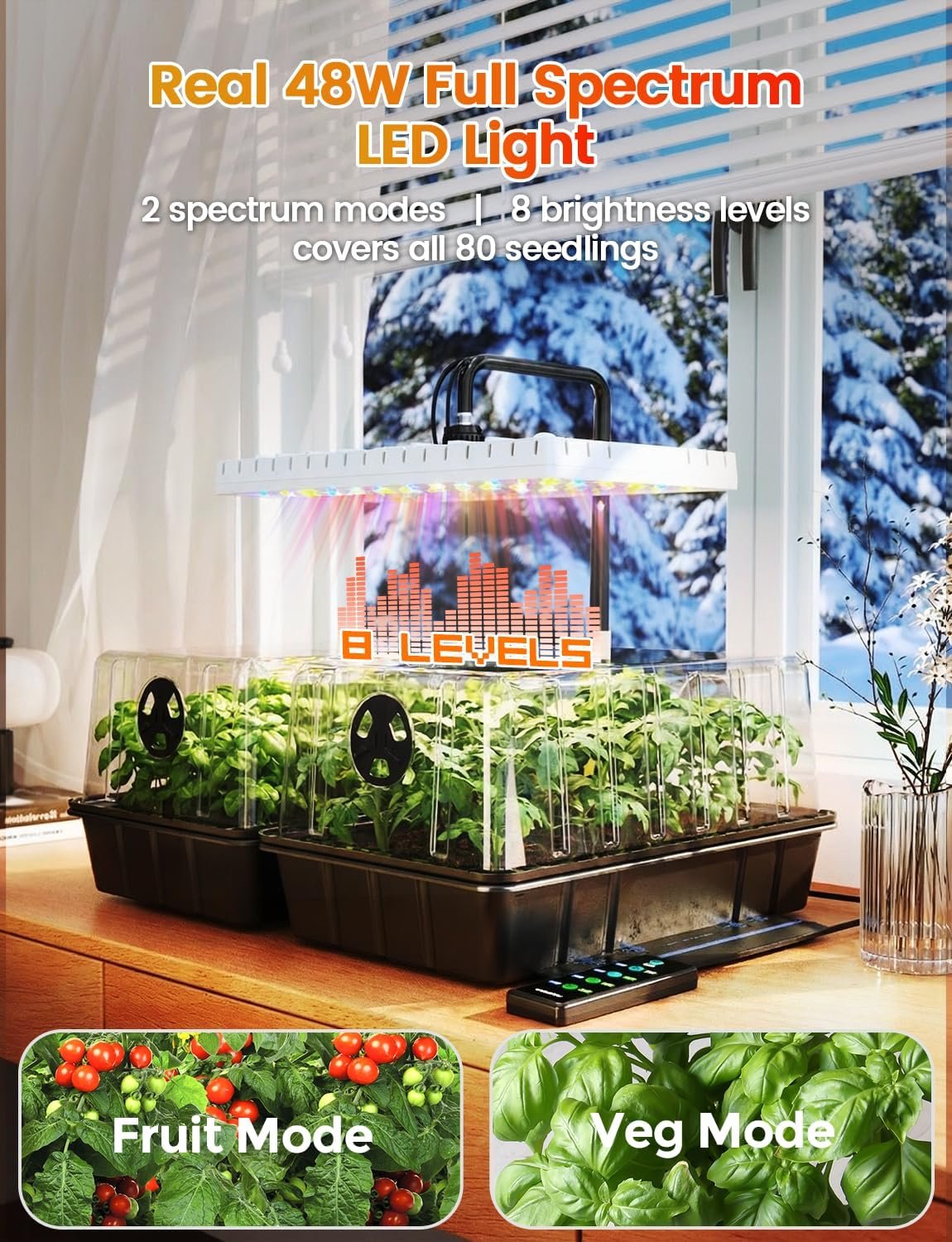 Prevent Leggy Seedlings:The 48W full spectrum grow light (APP + Remote control) delivers uniform coverage across the entire tray—unlike weak 10W light bars. 8 dimming levels & dual spectrum modes help support strong early seedling development and balanced growth. Works with seed starter tray with grow light & indoor seed starting kit setups.
